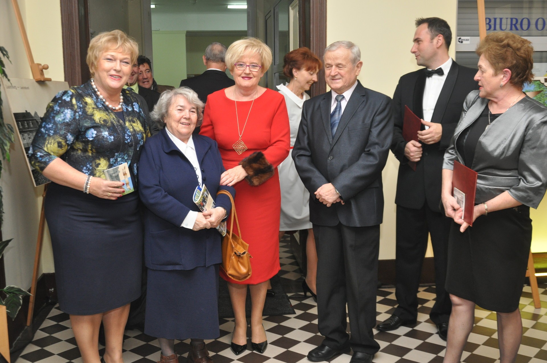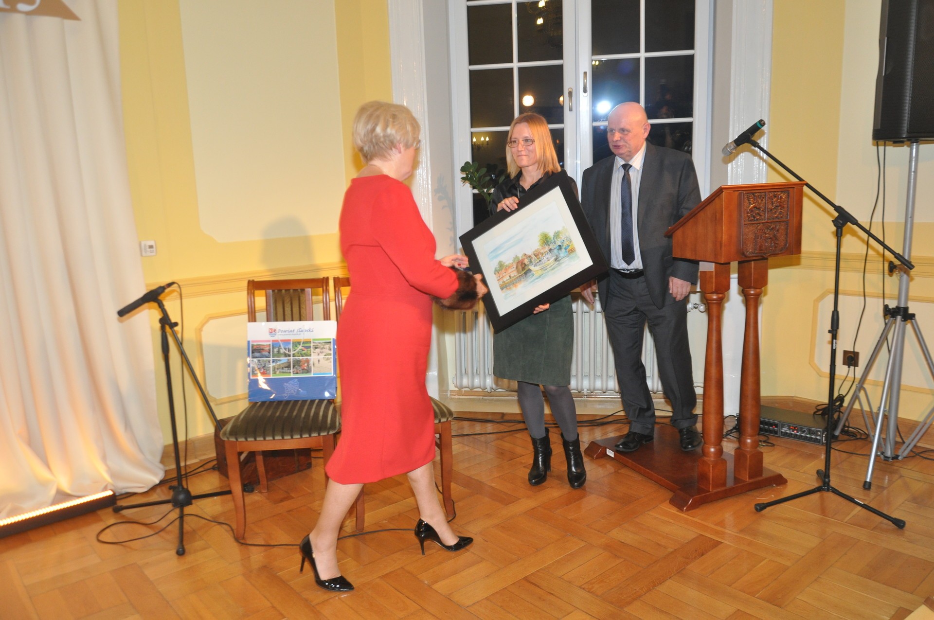 W holu głównym przedstawiono wystawę fotograficzną zdjęć budynku starostwa.