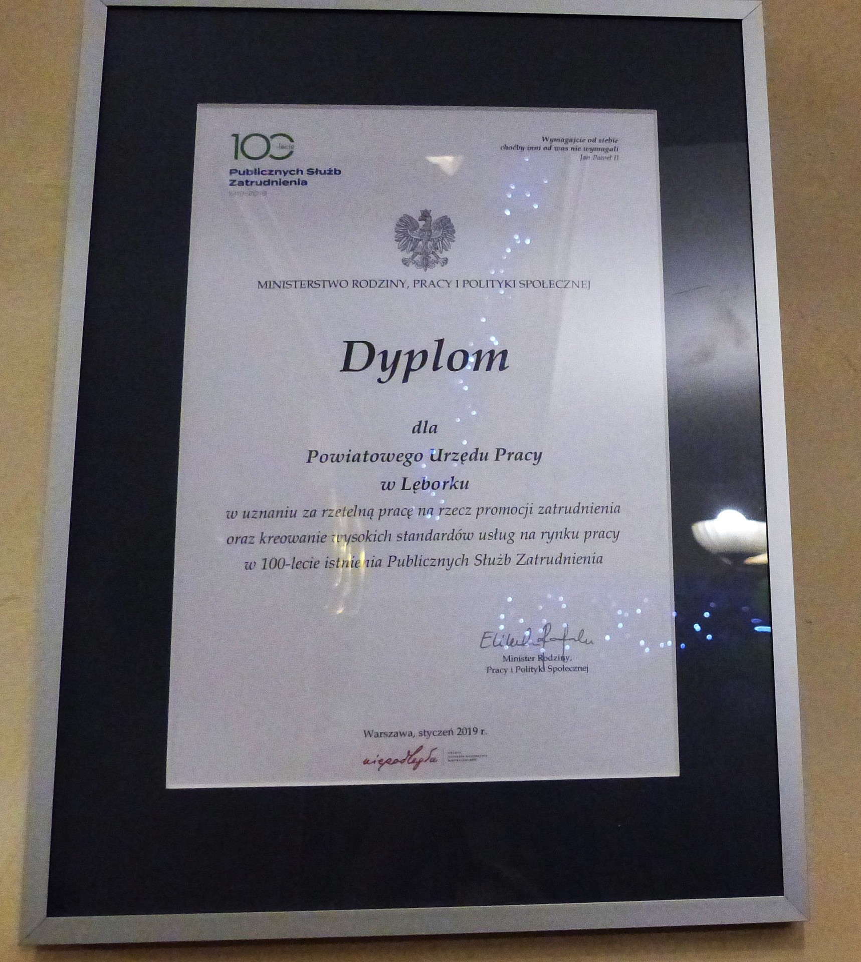 Lęborski Urząd Pracy otrzymał od Elżbiety Rafalskiej dyplom w uznaniu rzetelnej pracy na rzecz promocji zatrudnienia oraz kreowanie wysokich standardów na rynku pracy. W uroczystościach 100-lecia istnienia Publicznych Służb Zatrudnienia wspólnie z pracownikami lęborskiego PUP uczestniczyli: Alicja Zajączkowska – Starosta Lęborski i Edmund Głombiewski, Wicestarosta Lęborski.