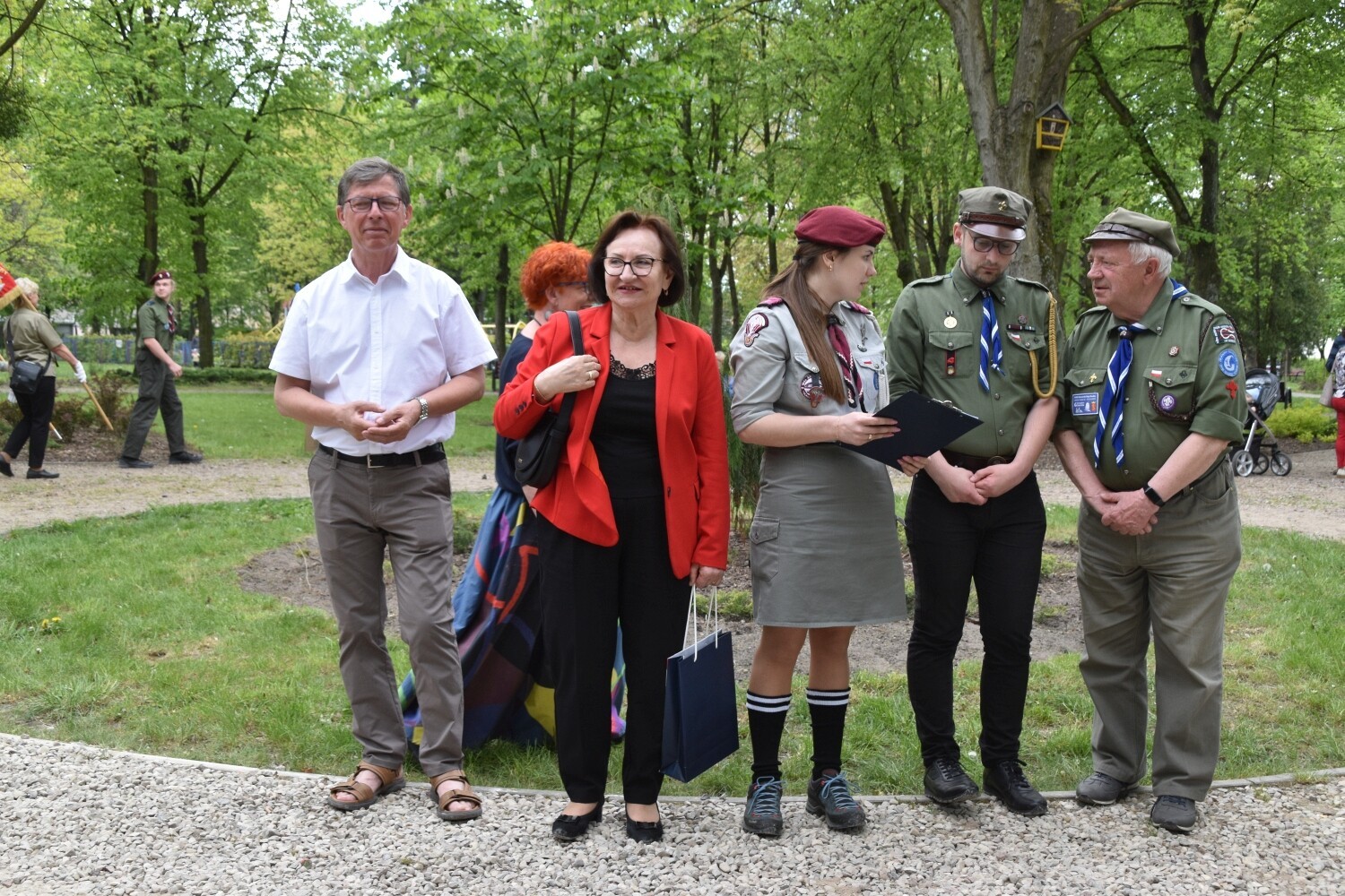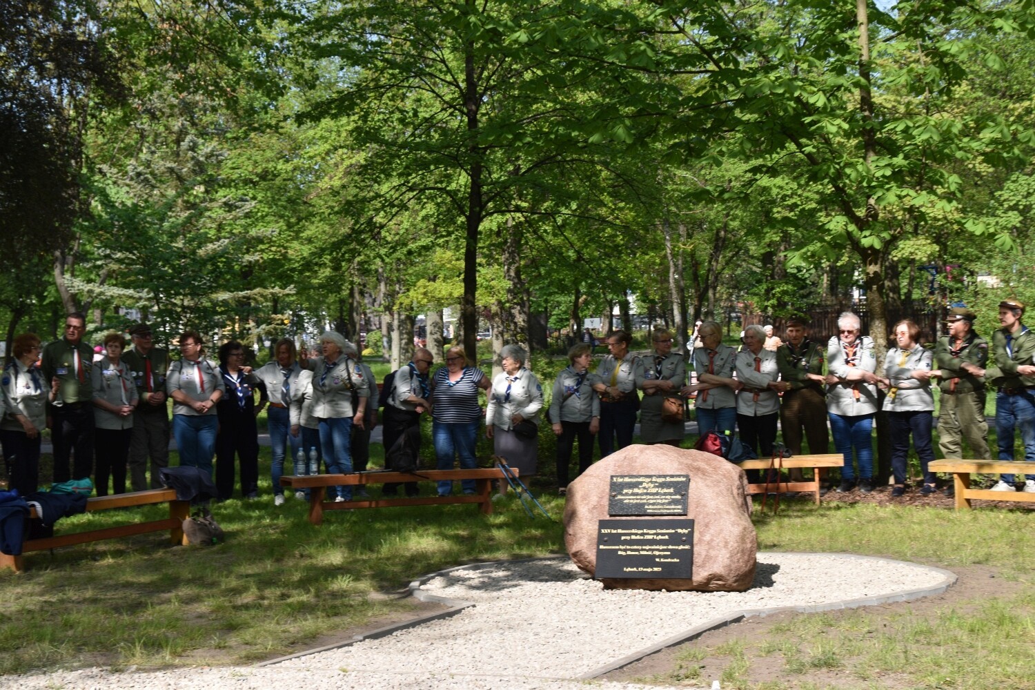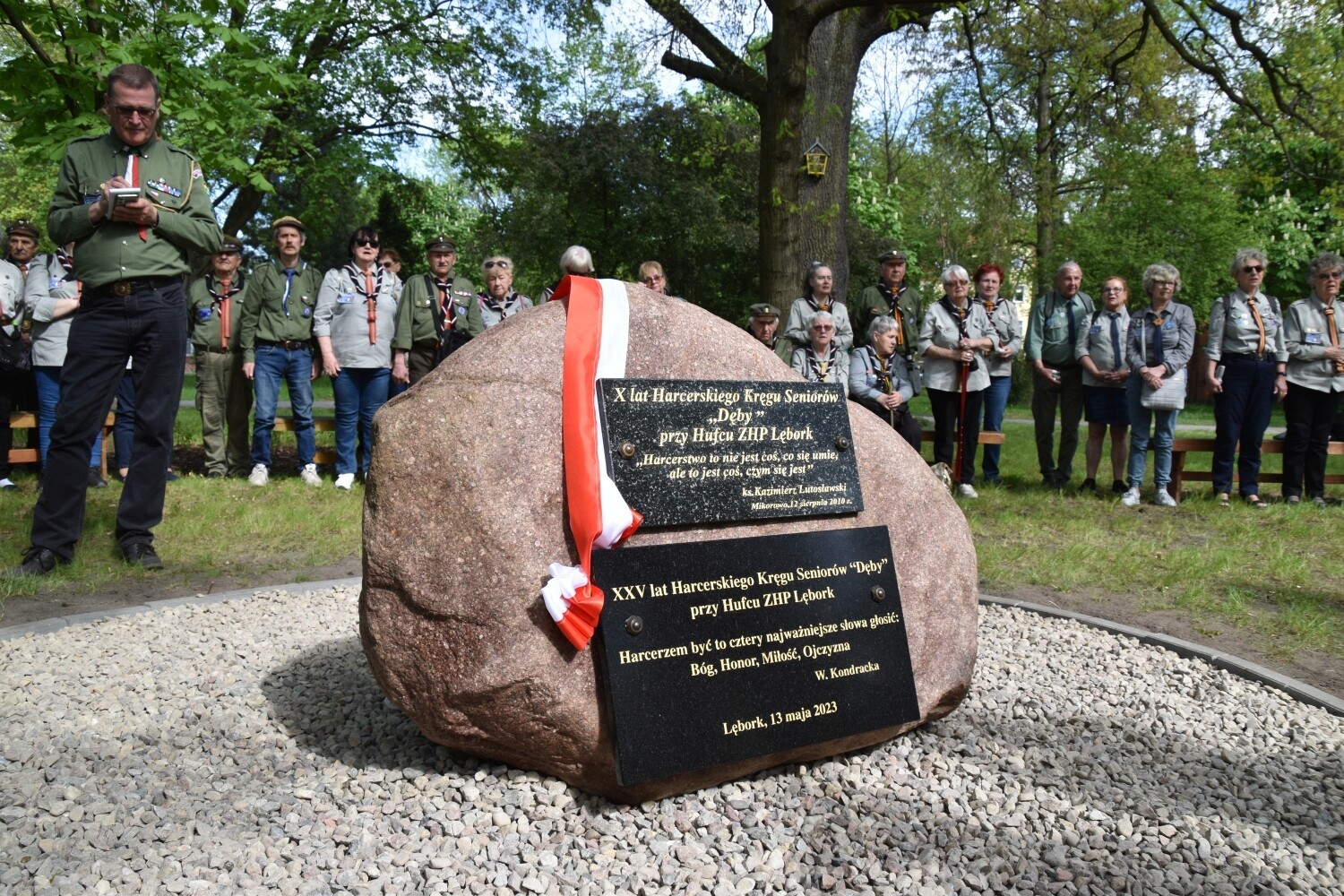 „Harcerzem być to cztery najważniejsze słowa głosić: Bóg, Honor, Miłość, Ojczyzna” – głosi inskrypcja autorstwa Wiesławy Kondrackiej – nauczycielki i harcerki z Lęborka - na rocznicowym kamieniu, przywołując drogowskazy moralne i harcerskie ideały. Tuż obok, na tym samym obelisku znalazła się tablica upamiętniająca rocznicowe spotkanie harcerzy „Dębów” sprzed 15 lat – w 10. rocznicę powstania kręgu z hasłem „Harcerstwo to nie jest coś, co się umie, ale to jest coś, czym się jest”. I to dosłownie definiuje postawę harcerskich seniorów z Lęborka. Zaczęło się bowiem od hm Jana Mrugasiewicza – pierwszego komendanta „Dębów”, który następnie przekazał honor dowodzenia hm Elżbiecie Wiktorowicz-Czapla, która rozwijała dzieło integracji seniorskiego kręgu zapoczątkowane przez dh Jana. Obecnie oboje w dalszym ciągu działają w kręgu, którym aktualnie dowodzi dh Małgorzata Bresler. Wszyscy dotychczasowi komendanci wzięli udział w uroczystości odsłonięcia obelisku. Towarzyszyli im: hm Łukasz Kochowski – komendant Chorągwi Gdańskiej, hm Bogdan Radys - kierownik Wydziału Seniorów Głównej Kwatery ZHP, jednocześnie komendant Kręgu Seniorów „Korzenie” z Gdańska. Wśród gości harcerskiego święta obecni byli: starosta Alicja Zajączkowska, członek Zarządu Powiatu Ryszard Wenta, a także przedstawiciele miasta – burmistrz Witold Namyślak z zastępcą Jerzym Pernalem. Okolicznościowe medale wręczała phm Agnieszka Kłosowska – komendantka Hufca ZHP Lębork.