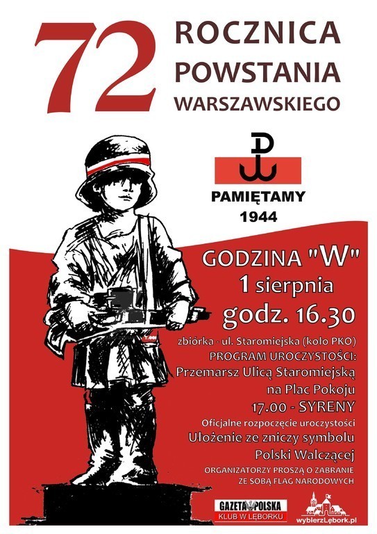 W dniu 1 sierpnia (poniedziałek) o godz. 17.00 na Placu Pokoju odbędą się uroczystości związne z 72 rocznicą Powstania Warszawskiego. Zbiórka uczestników od godz. 16.30 na ul. Staromiejskiej przy Banku PKO, skąd mieszkańcy Lęborka przemaszerują na Plac Pokoju.