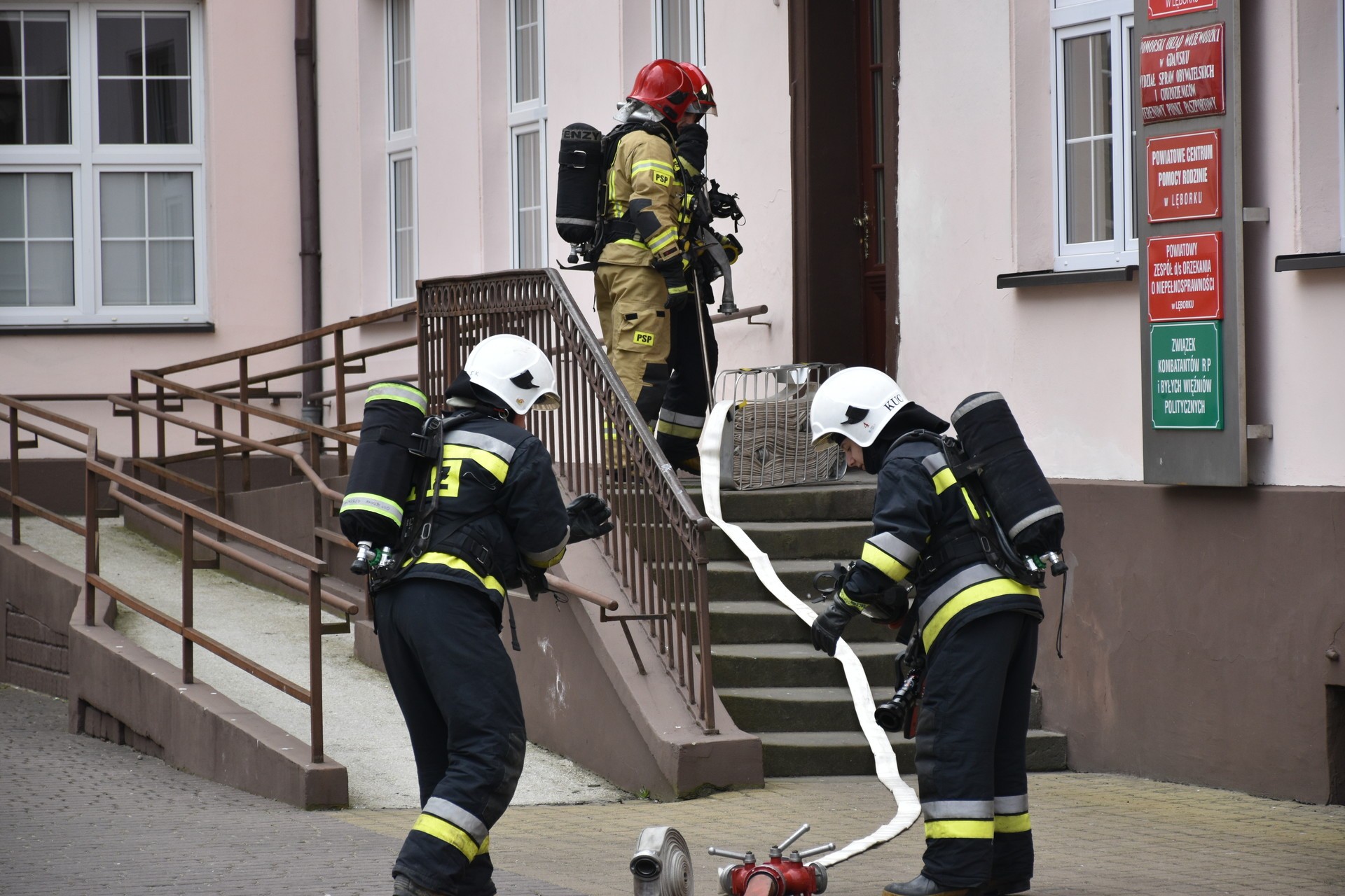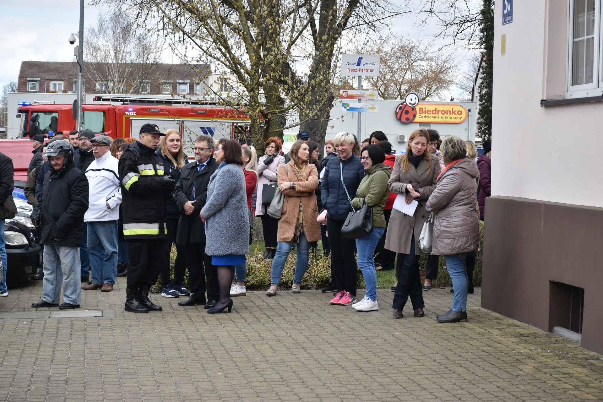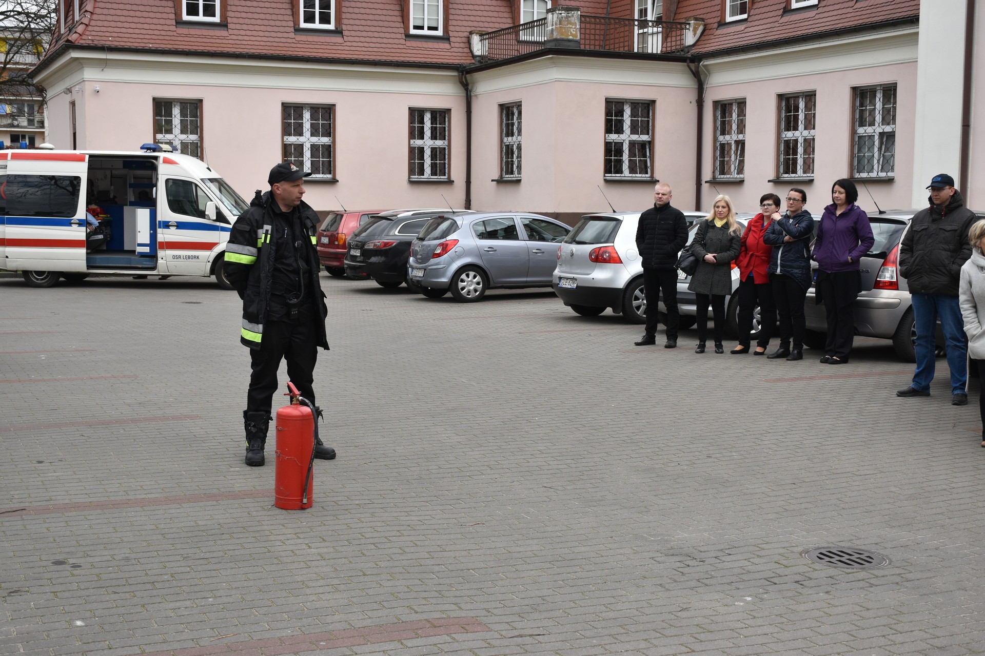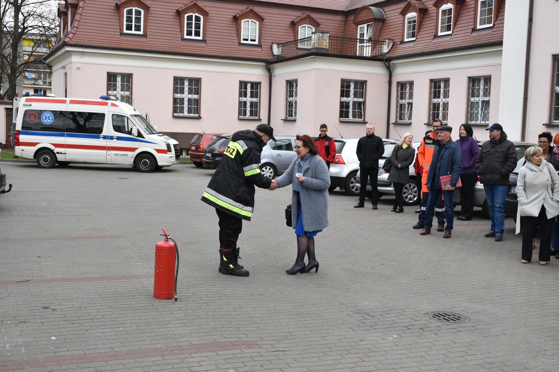 Akcja ewakuacji I stopnia ludności z rejonu zagrożenia życia i zdrowia rozpoczęła się od symulowanego pożaru na II kondygnacji budynku Starostwa. Ćwiczenia miały za zadanie zweryfikowanie znajomości Instrukcji Bezpieczeństwa Pożarowego przez pracowników Starostwa. Opracowana dla urzędu Instrukcja Bezpieczeństwa ma za zadanie w sytuacji zagrożenia, zastosowanie procedur służących ochronie zdrowia i życia klientów urzędu oraz pracowników. To również test koordynacji działań służb ratowniczych, od momentu skutecznego powiadomienia o zagrożeniu, do zakończenia czynności ratowniczych. Utrudniony dostęp do miejsca wystąpienia symulowanego zagrożenia wymusił zastosowanie specjalistycznego sprzętu ratowniczo-gaśniczego, w tym strażackiej drabiny, będącej na wyposażeniu Jednostki Ratowniczo – Gaśniczej Państwowej Straży Pożarnej w Lęborku. W ćwiczeniu uczestniczyli również strażacy z Ochotniczej Straży Pożarnej, zespół wyjazdowy Ochotniczej Służby Ratowniczej, Jednostka Ratowniczo Gaśnicza z Jednostki Wojskowej 4653 w Siemirowicach, policjanci z Komendy Powiatowej Policji w Lęborku i pracownicy firmy ochroniarskiej „Jantar”. W trakcie ćwiczenia odbył się również instruktaż z zastosowania środków gaśniczych i pokaz użycia przenośnego defibrylatora podczas udzielania pierwszej pomocy.