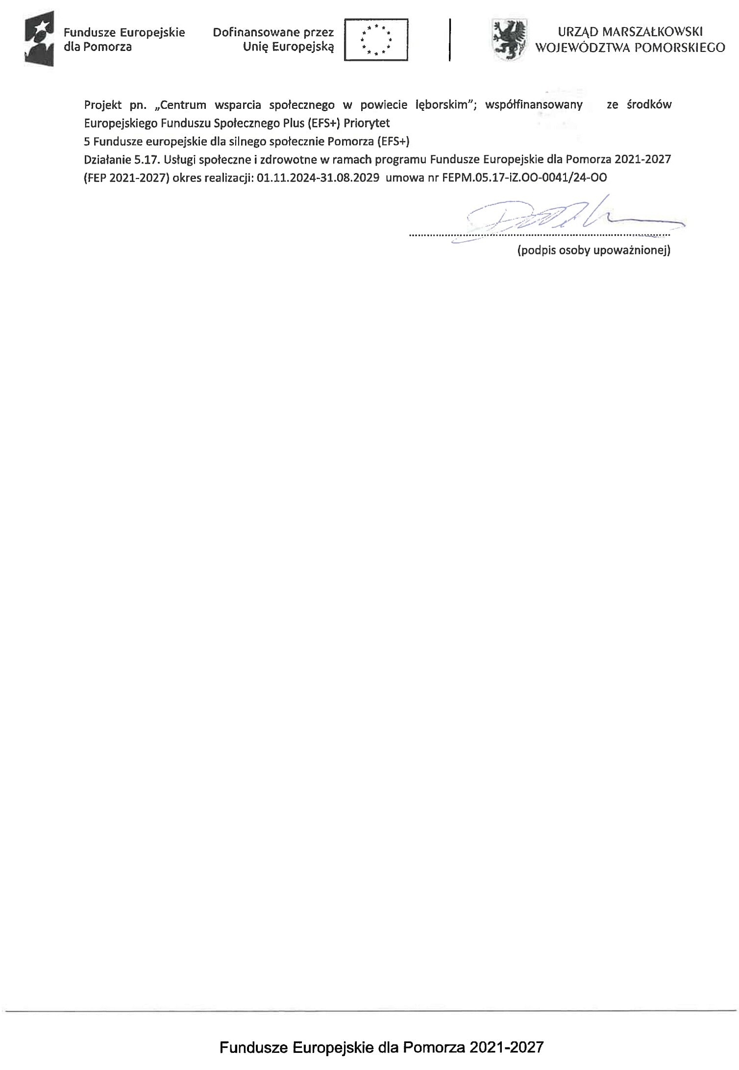 Projekt współfinansowany ze środków Europejskiego Funduszu Społecznego Plus (EFS+) Priorytet 5 Fundusze europejskie dla silnego społecznie Pomorza (EFS+), Działanie 5.17. Usługi społeczne i zdrowotne w ramach programu Fundusze Europejskie dla Pomorza 2021-2027 (FEP 2021-2027).