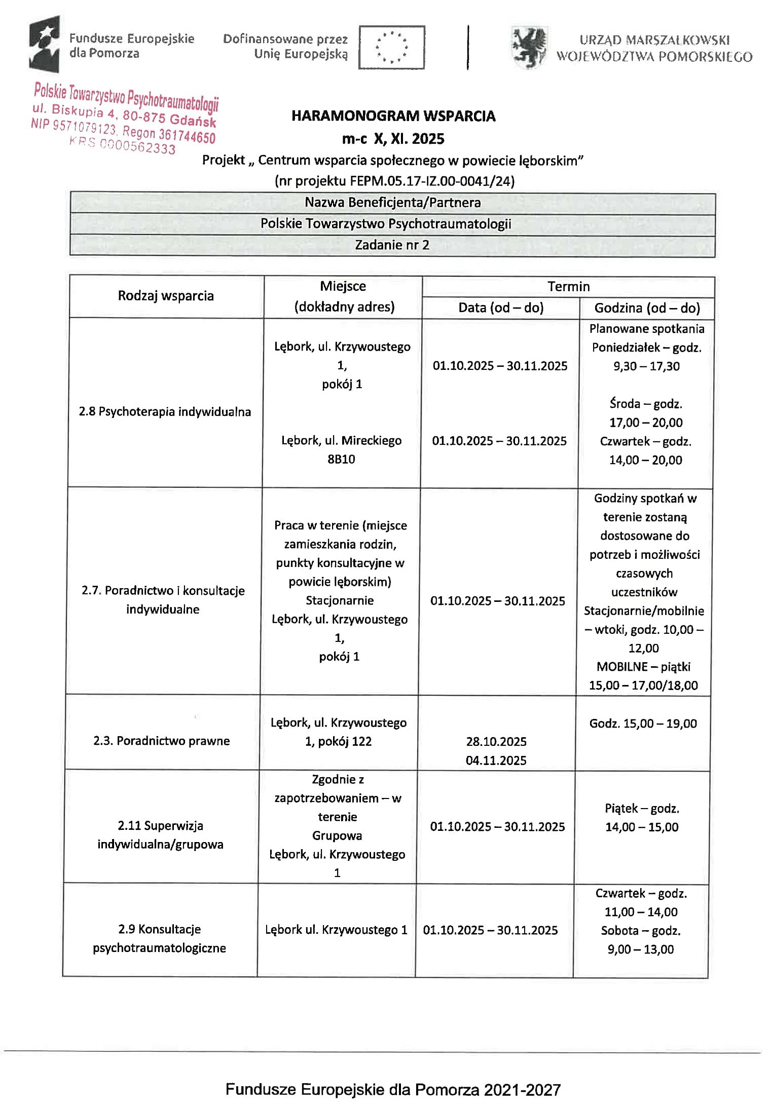 Powiat Lęborski publikuje zaktualizowany harmonogram wsparcia na miesiące październik i listopad 2025 r. realizowany w ramach Projektu „Centrum wsparcia społecznego w powiecie lęborskim”.