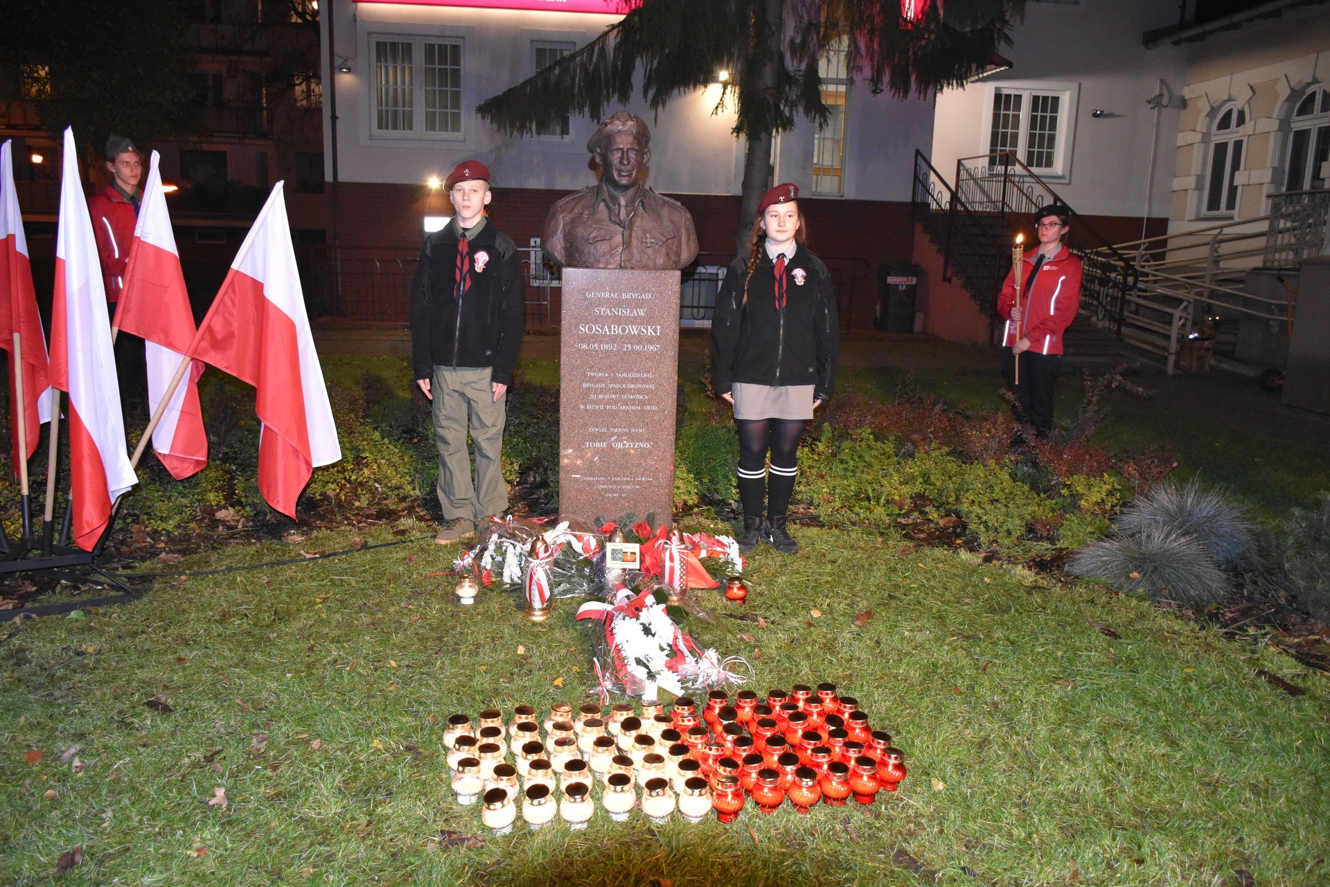 W przeddzień 101 rocznicy odzyskania przez Polskę niepodległości lęborski Hufiec ZHP im. Polskich Olimpijczyków zorganizował uroczysty capstrzyk przy pomniku gen. Stanisława Sosabowskiego, który ze względu na spadochronowe tradycje lęborskich harcerzy jest im postacią szczególnie bliską. Gen. Sosabowski był organizatorem i dowódcą 1 Samodzielnej Brygady Spadochronowej w szeregach której walczył w bitwie pod Arnhem. Był również członkiem ruchu strzeleckiego i skautingu. Pomnik gen. Sosabowskiego stanął w pobliżu lęborskiej biblioteki w październiku 2017 r. Wzniesiony został siłami społecznymi, dzięki pasjonatom z 7 Harcerskiej Drużyny Czerwonych Beretów im. Gen. St. Sosabowskiego, pielęgnującej pamięć o bohaterze i jego żołnierzach już od ponad 35 lat. Uroczystości pod pomnikiem generała rozpoczęły się odśpiewaniem hymnu państwowego. Po Apelu Poległych i symbolicznym ułożeniu ze zniczy polskiej flagi, harcerze zaprosili uczestników do Komendy Hufca na poczęstunek i prezentację multimedialną o tegorocznych obchodach rocznicy bitwy pod Arnhem w Holandii, w których uczestniczyli.
