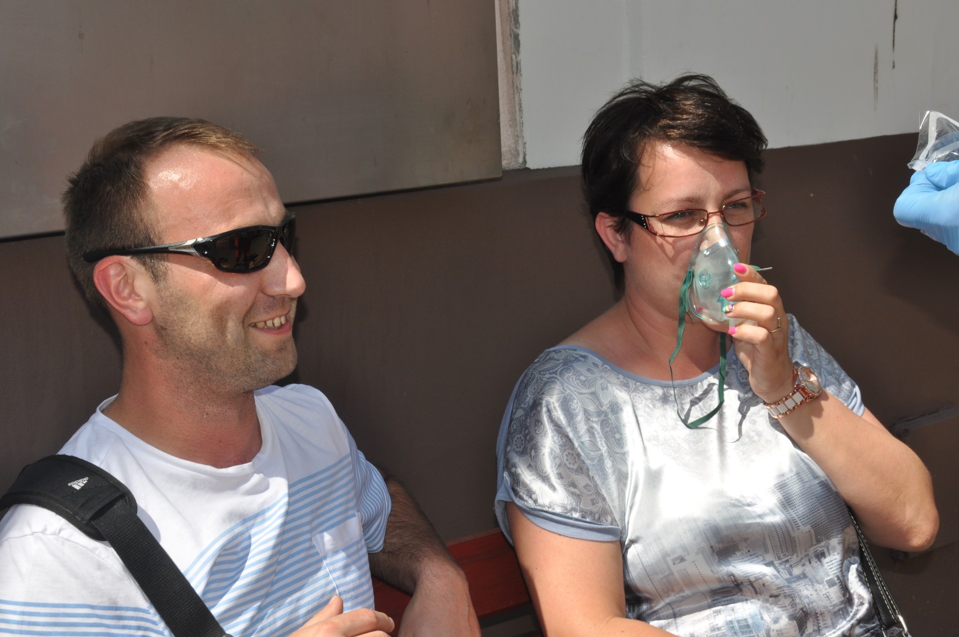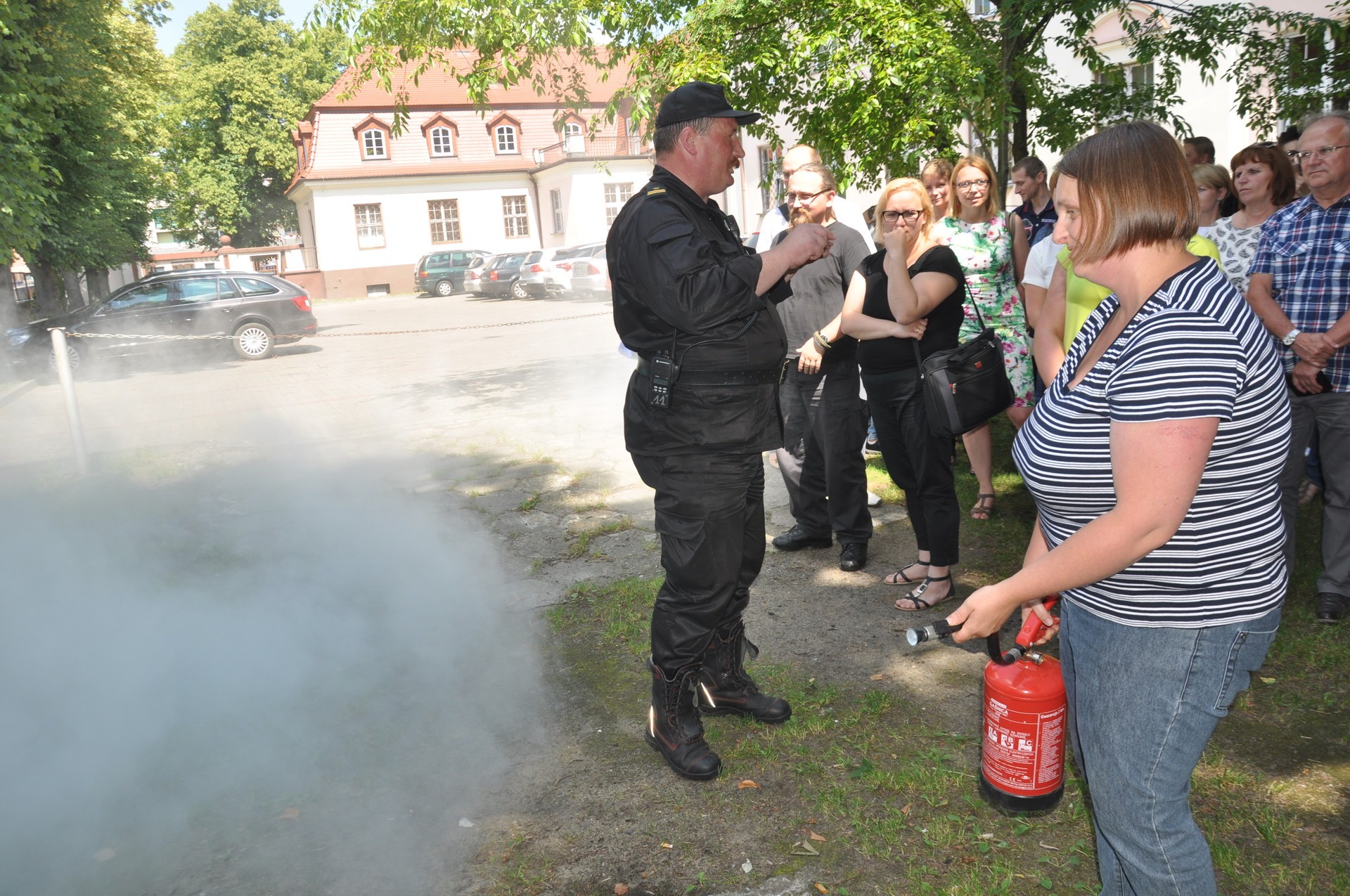 Konserwator natychmiast przystąpił do próby ugaszenia pożaru gaśnicą przenośną alarmując jednocześnie głośno pracowników wydziału o powstałym zagrożeniu. Jednak mimo próby gaszenia palącej się ściany ogień szybko się rozprzestrzenia zajmując również ubranie konserwatora co spowodowało poparzenie jego ciała. W tym czasie wyczuwalny jest już zapach spalenizny oraz coraz gęstszy dym na korytarzu I i II piętra. Kierownik Ośrodka Geodezyjno-Kartograficznego poinformowany głośnymi krzykami swoich pracowników natychmiast powiadomił telefonicznie Straż Pożarną i Starostę. O godz. 1330 Starosta zarządziła ewakuację ludzi z budynku Starostwa. W czasie ewakuacji pracownica Wydziału Edukacji i Spraw Społecznych podczas wybiegania na korytarz z pokoju numer 130, potknęła się i upadając doznała skręcenia kostki prawej nogi. Jest przy niej jej koleżanka i kolega, którzy się nią zaopiekowali. W międzyczasie pożar zaczął zajmować korytarz w okolicy pomieszczenia Wydziału Geodezji numer 125 – 126 uniemożliwiając samoewakuację poszkodowanej pracownicy Wydziału Edukacji i Spraw Społecznych oraz osób zajmujących się nią. Dym i wydzielające się gazy powodują u tych osób duszności i osłabienie. Z kolei przebywający w urzędzie członek Związku Kombatantów RP i Byłych Więźniów Politycznych w wyniku stresu z zaistniałej sytuacji zasłabł i jest podejrzenie, że doznał zawału serca. Reanimację podjęli pracownicy Referatu Rozwoju i Promocji.