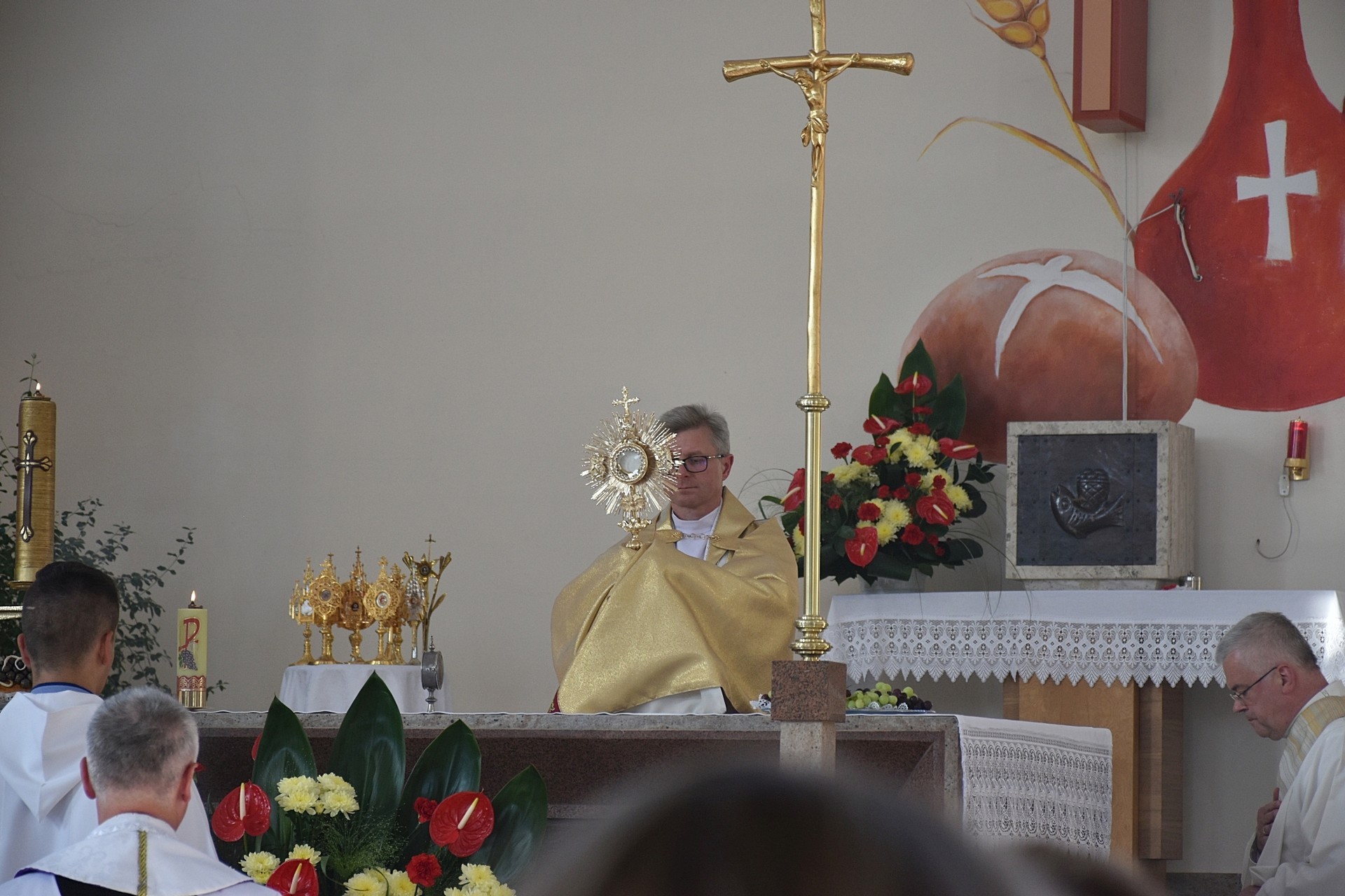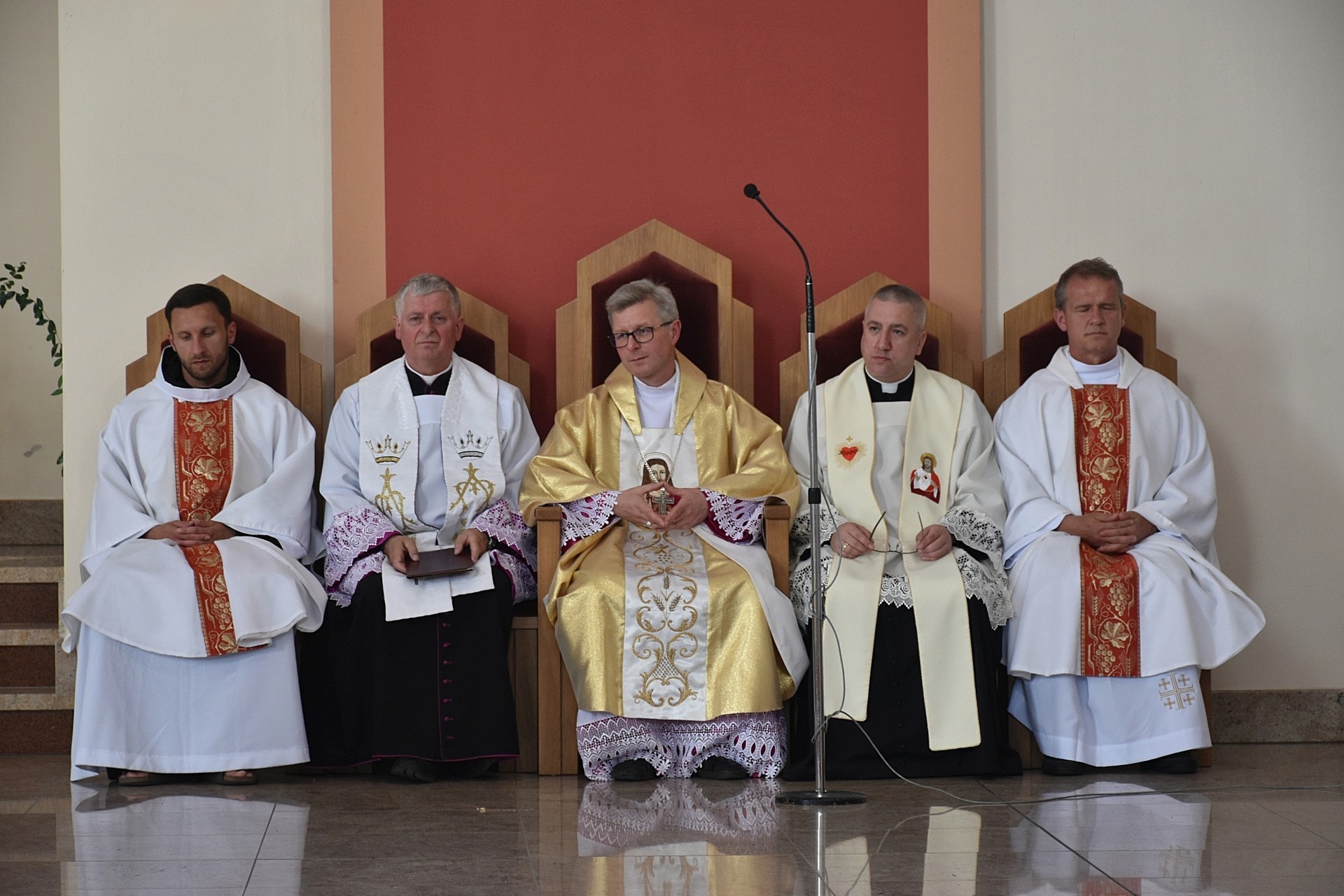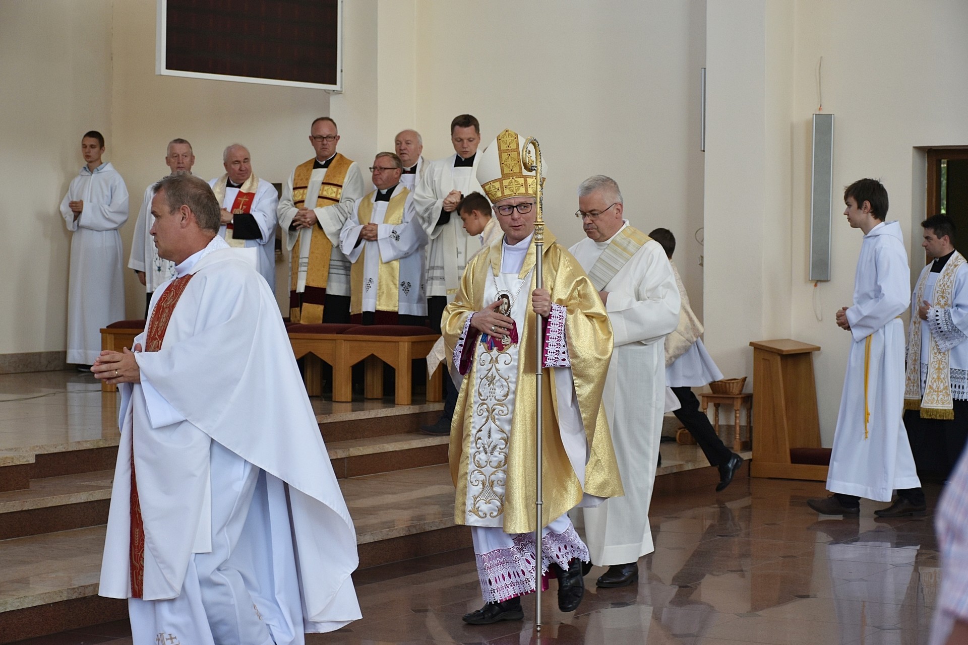 Nietypowo, bo od wspomnień początków parafii, rozpoczęło się nabożeństwo odpustowe, upamiętniające ćwierćwiecze istnienia parafii, a jednocześnie ćwierćwiecze sprawowania funkcji proboszcze przez ks. kanonika Tomasz Króla. Był również czas na wspomnienie 12 wikariuszy, którzy w tej parafii sprawowali posługę na przestrzeni minionego ćwierćwiecza, z których większość uczestniczyła w rocznicowym modlitewnym spotkaniu, podobnie jak pozostali księża dekanatu lęborskiego z dziekanem ks. Sławomirem Prabuckim. W uroczystościach wziął udział także o. Roman Zioła, proboszcz parafii św. Jakuba Ap. i jednocześnie kustosz miejscowego Sanktuarium. Dziękczynną mszę odpustową odprawił ks. biskup pomocniczy, Arkadiusz Okrój. Ks. biskup poprowadził także procesję kończącą nabożeństwo. Życzenia na ręce ks. kan. T. Króla złożyli przedstawiciele władz samorządowych: Alicja Zajączkowska, Starosta Lęborki i Witold Namyślak, Burmistrz Miasta Lęborka oraz przedstawiciele wspólnot modlitewnych parafii. W imieniu posła Piotra Müllera życzenia na ręce ks. Króla złożył jego asystent, Marcin Brodalski.