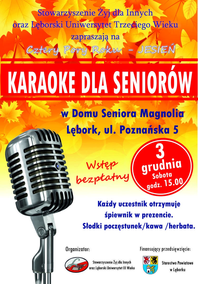 Stowarzyszenia Żyj dla Innych i Lęborski Uniwersytet Trzeciego Wieku zapraszają na kolejne spotkanie z cyklu "Cztery pory Roku " JESIEŃ czyli karaoke dla seniorów, które odbędzie się w dniu 3 grudnia 2016 (sobota) o godz. 15.00 w Domu Seniora Magnolia w Lęborku.