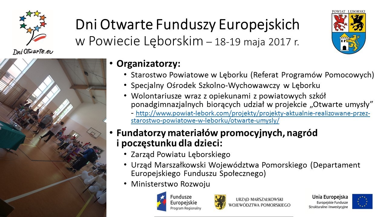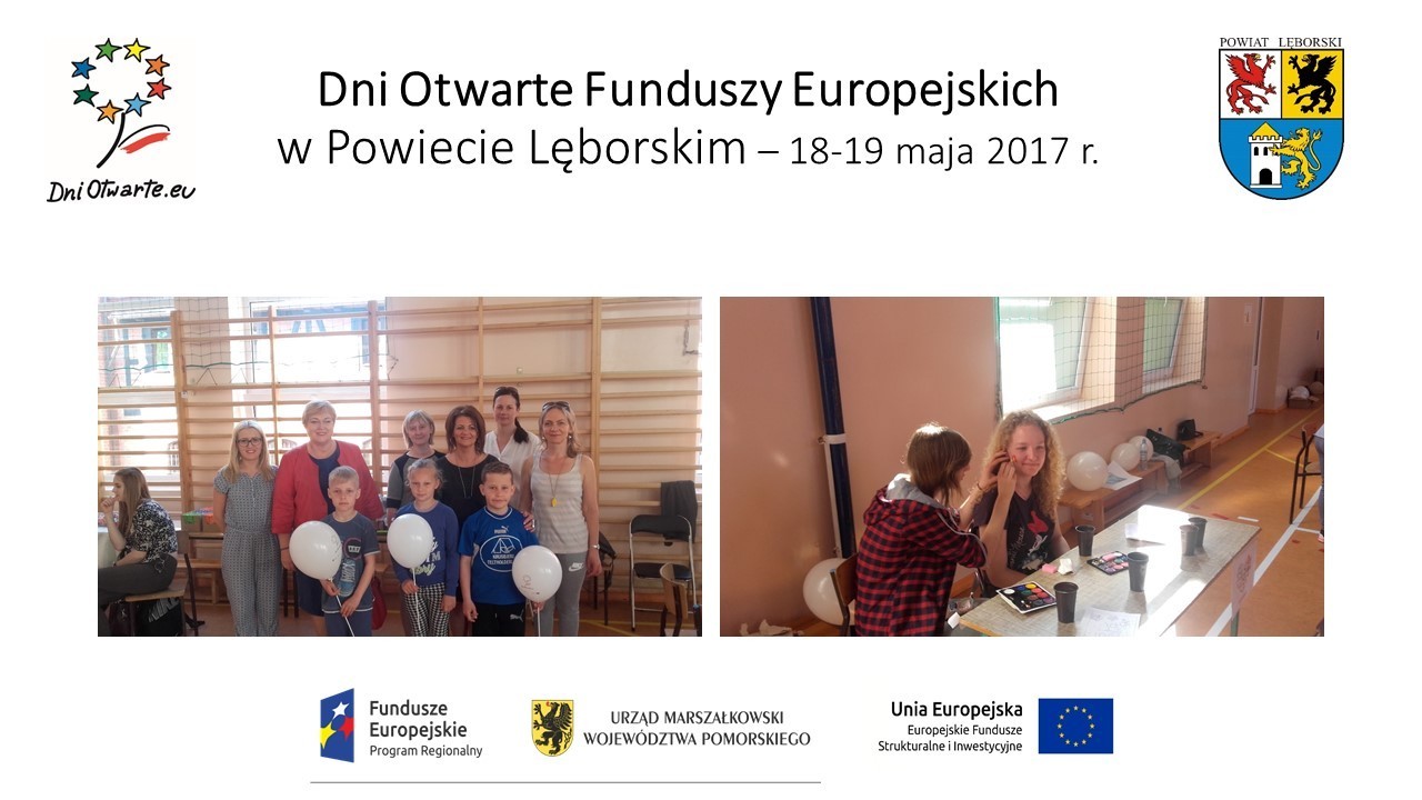 W dniach 18 i 19 maja 2017 roku po raz czwarty spotkaliśmy się na Dniach Otwartych Funduszy Europejskich w Powiecie Lęborskim. Miejscem spotkania tym razem była sala gimnastyczna Specjalnego Ośrodka Szkolno-Wychowawczego w Lęborku, wybudowana w 2012 roku przy współfinansowaniu Europejskiego Funduszu Rozwoju Regionalnego w ramach projektu „Rewitalizacja Centrum Lęborka”