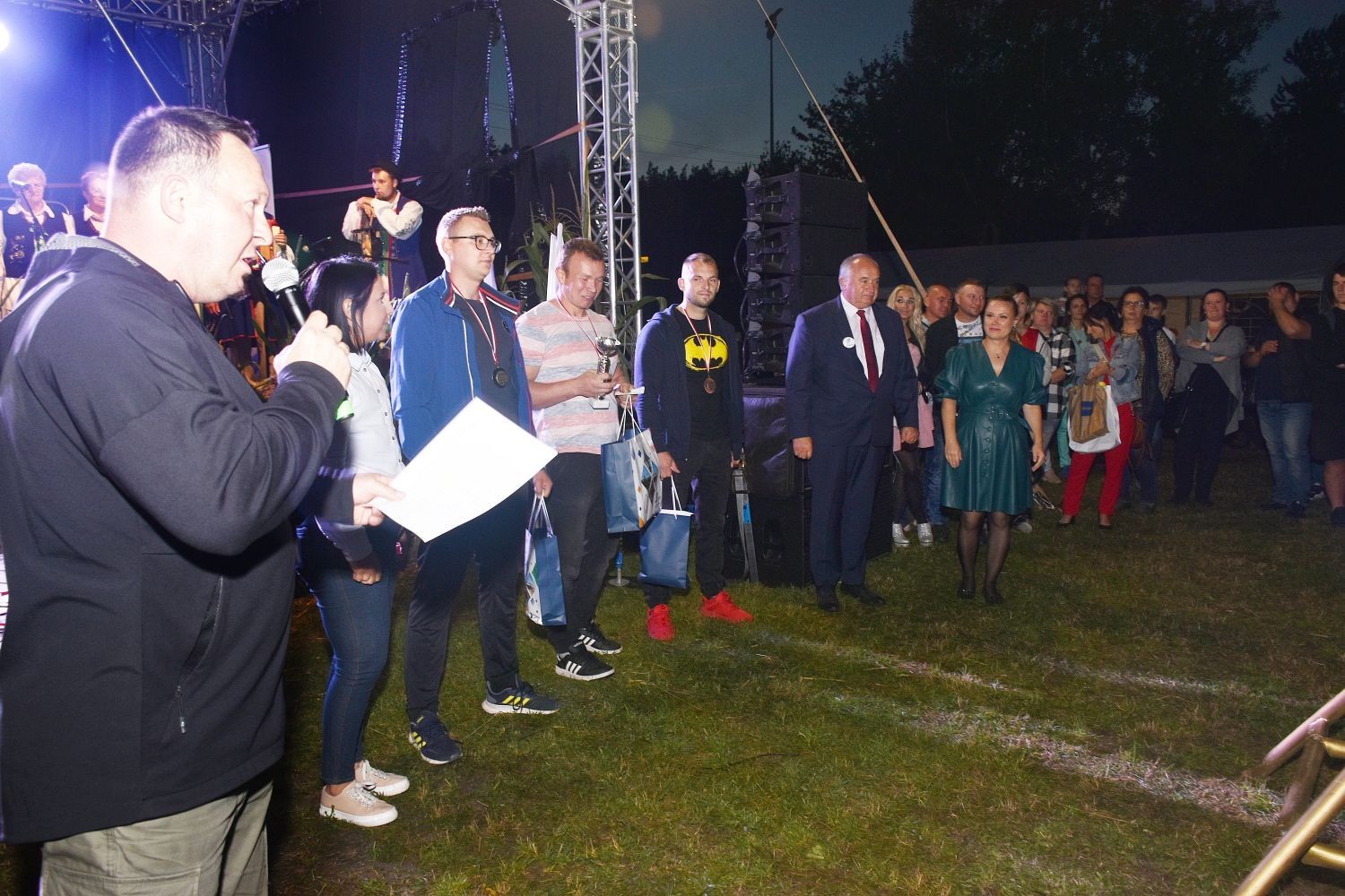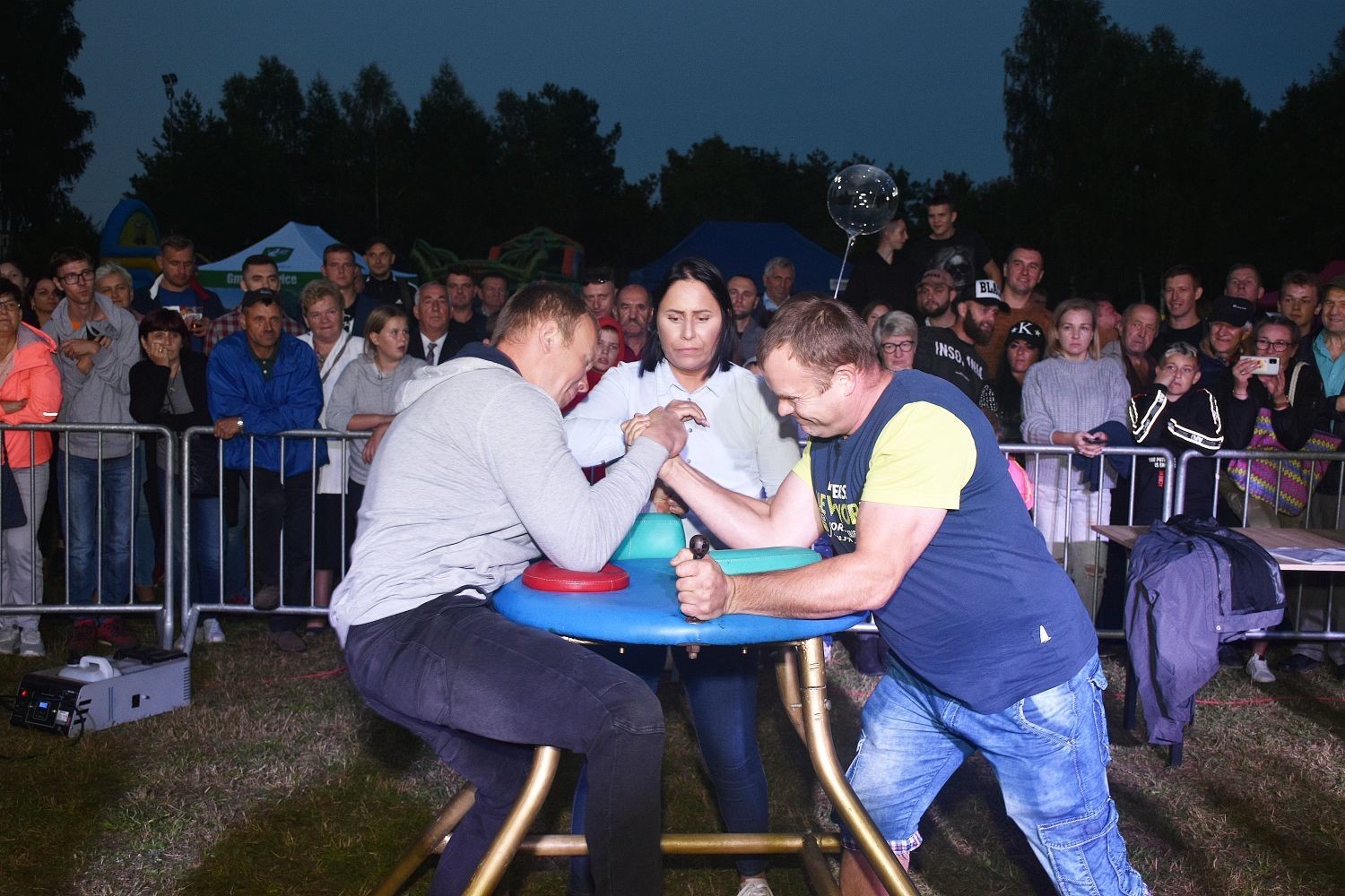 Wieczorem – amatorzy sportów siłowych mogli zmierzyć się w siłowaniu na rękę „Mocarz Dożynkowy”, które poprowadziła firma Organizacja Imprez „Ligo”. W turnieju rozegrano dwie kategorie otwarte – dla pań i dla panów. Zamiast fajerwerków na koniec imprezy, zaprezentowany został o wiele bezpieczniejszy i bardziej widowiskowy pokaz laserowy na nocnym niebie. Tuż potem do posłuchania i do tańca zagrał zespół „Mover”.