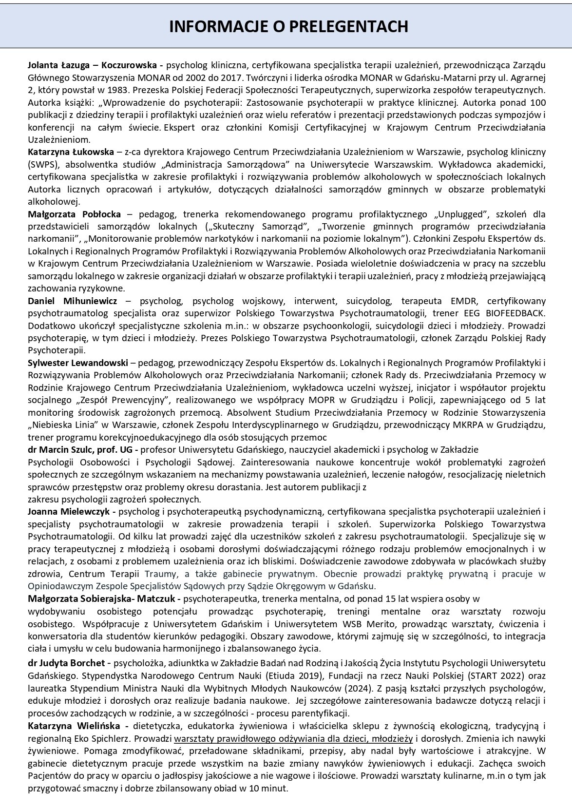 Kolejny dzień to analiza skuteczności programów profilaktycznych trafiających do szkół i samorządów, wykład na temat pokolenia „Z” i międzypokoleniowych relacji oraz pakiet zajęć warsztatowych, wśród których znalazł się zakres oswajania stresu i skutecznego przeciwdziałania wypaleniu zawodowemu, osobisty dobrostan i zagadnienia dotyczące dietetyki, akceptacji siebie i umiejętnego modyfikowania nawyków.