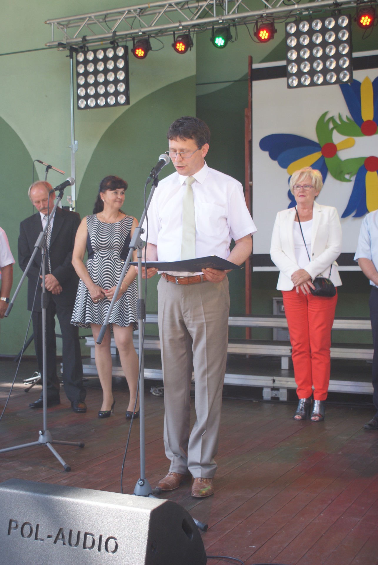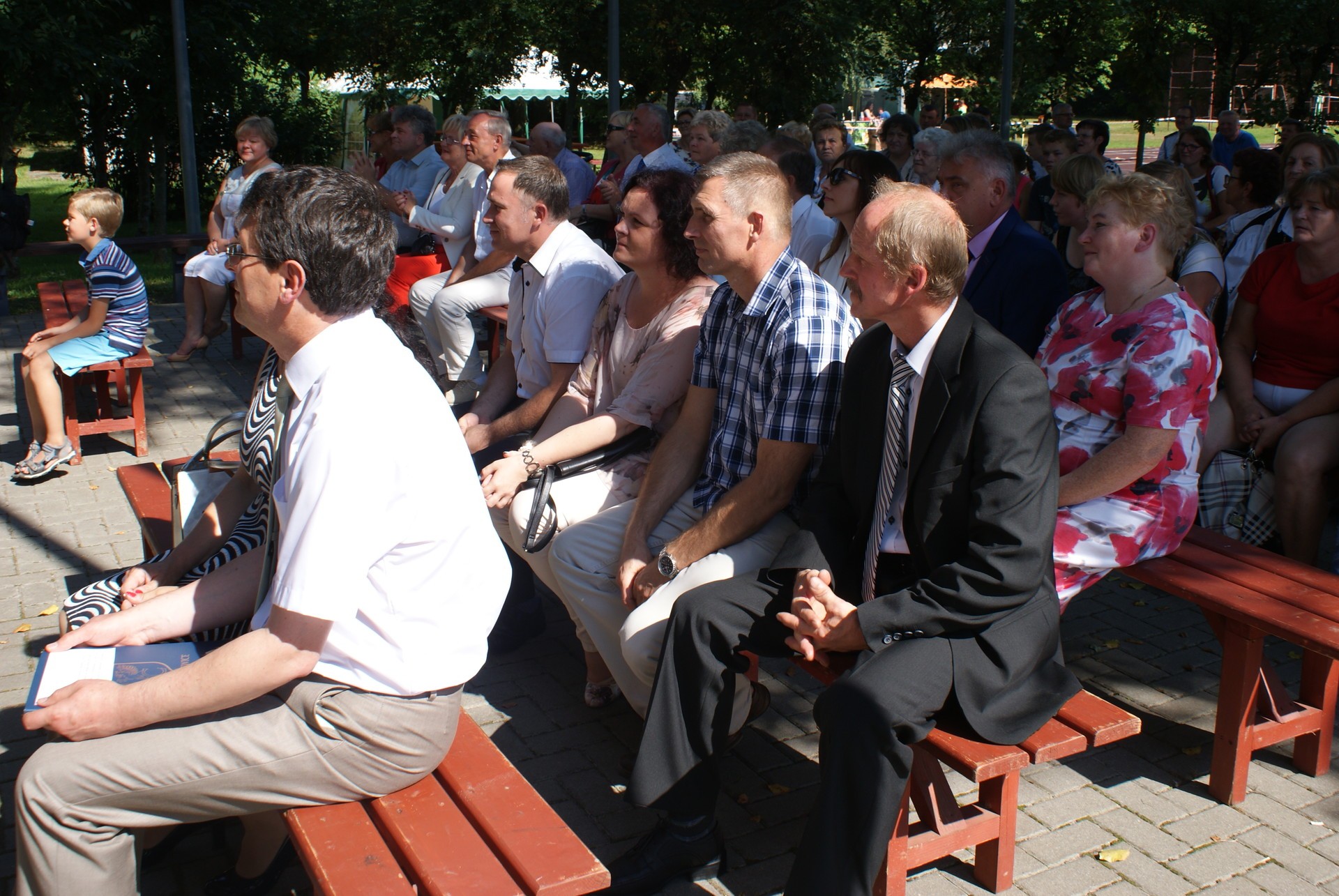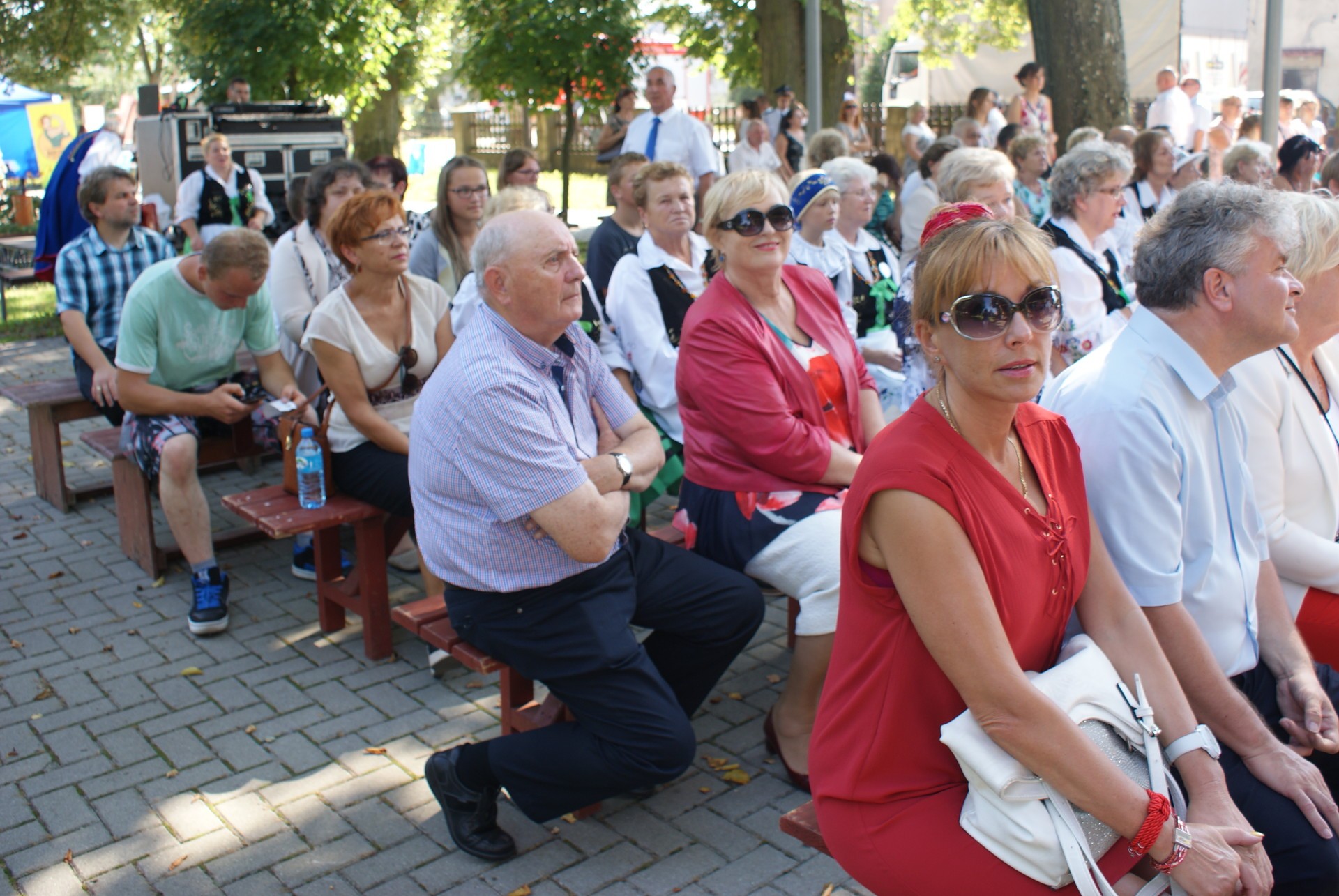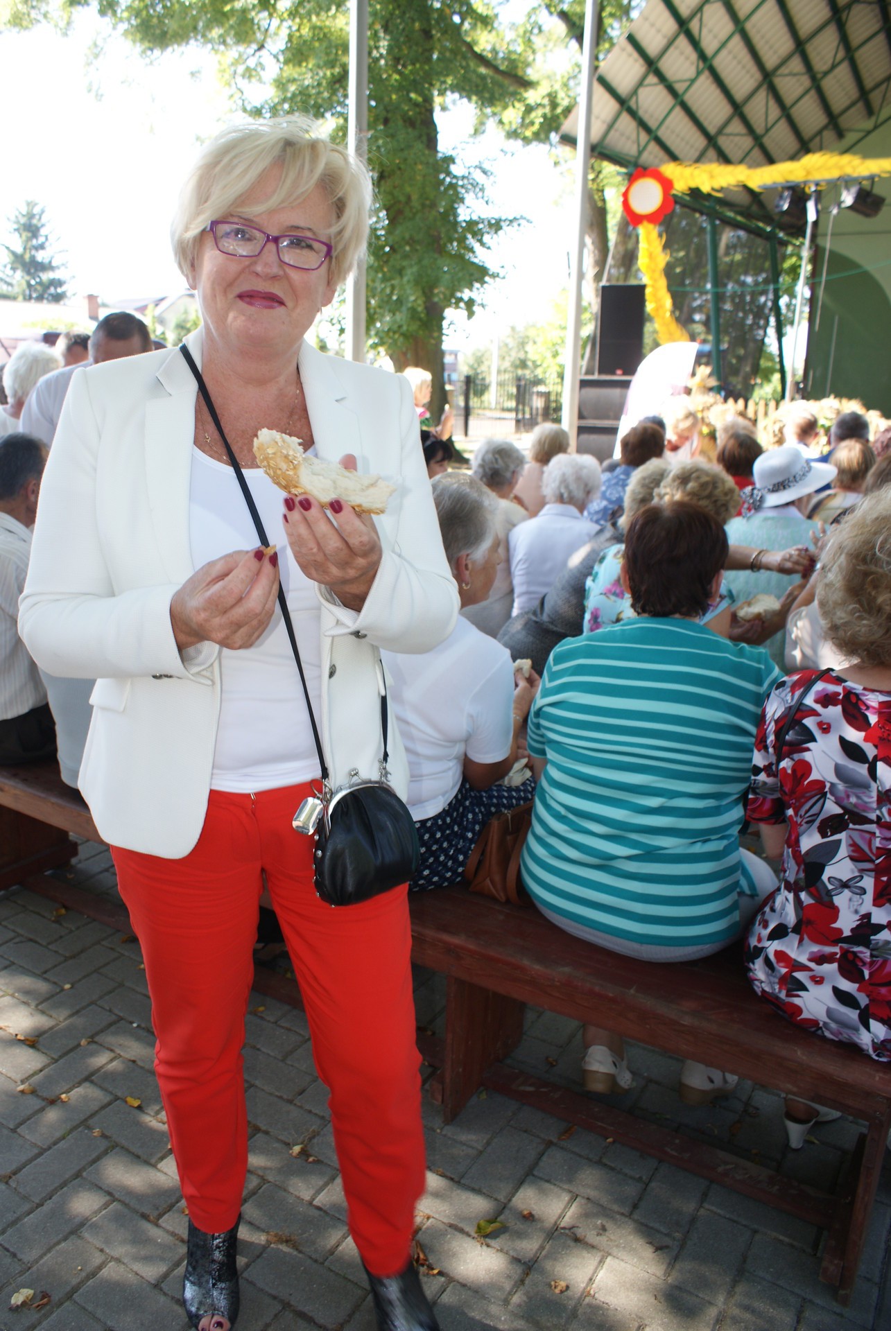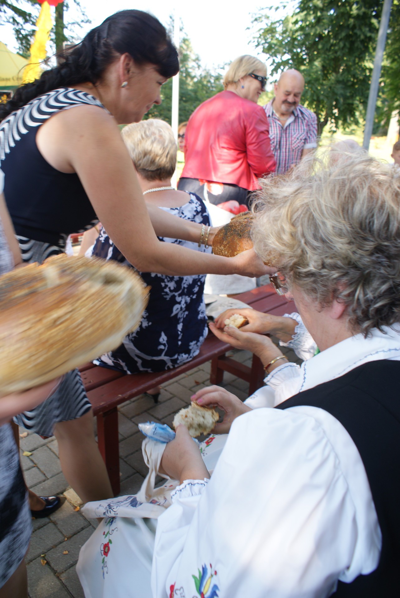 Po przywitaniu gości nastąpił tradycyjny obrzęd dożynkowy, przekazanie przez starostów chleba wójtowi i podzielenie się tegorocznymi plonami ze wszystkimi zgromadzonymi. W dzieleniu chleba udział wzięli także sołtysi z terenu Gminy Cewice oraz zaproszeni goście – Starosta Lęborski Pani Teresa Ossowska – Szara oraz Burmistrz Lęborka Pan Witold Namyślak.