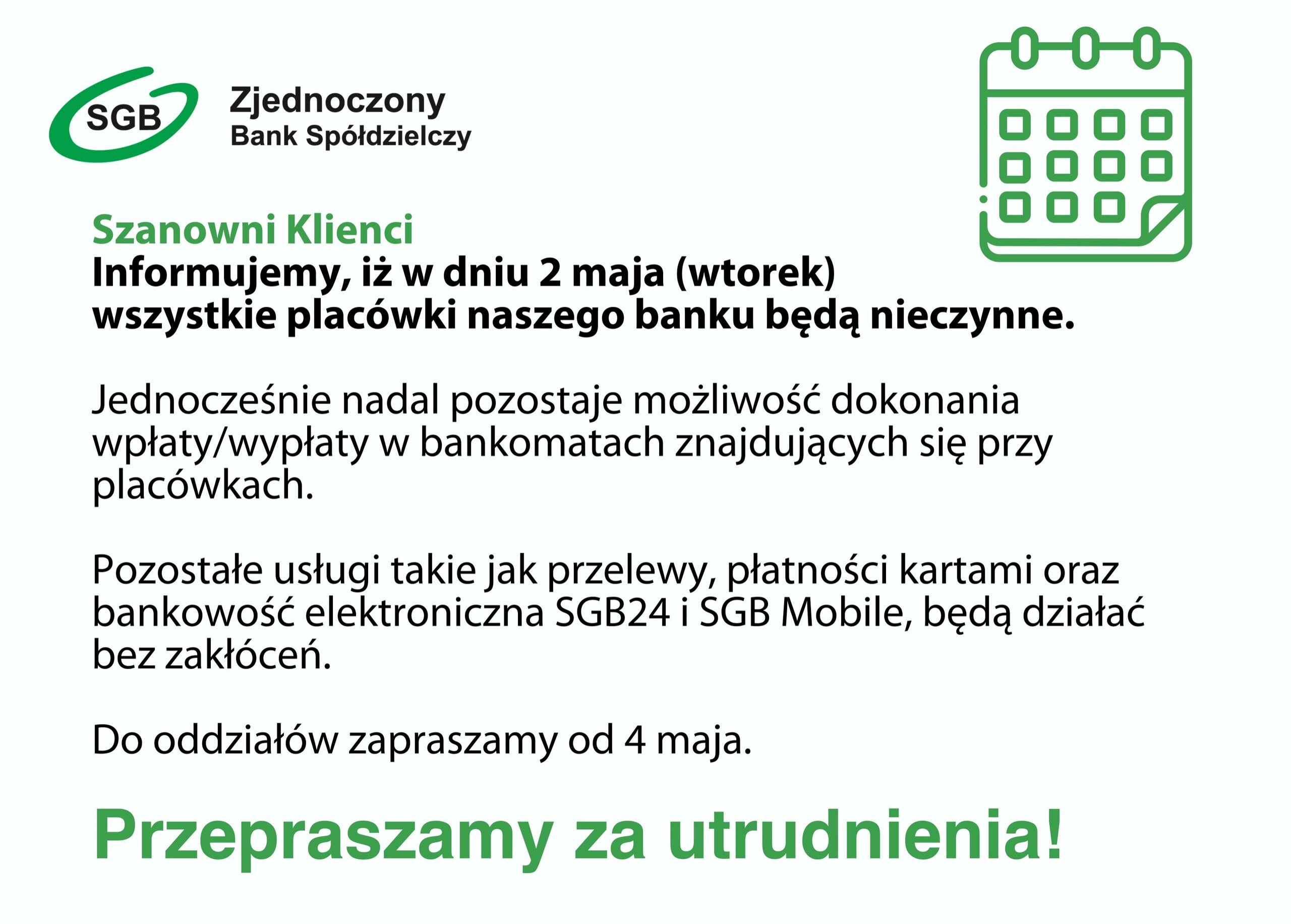 Dyrektor Oddziału SGB w Lęborku informuje, że w dniu 2 maja punkt kasowy znajdujący się w Starostwie Lęborskim oraz pozostałe placówki Zjednoczonego Banku Spółdzielczego będą zamknięte.