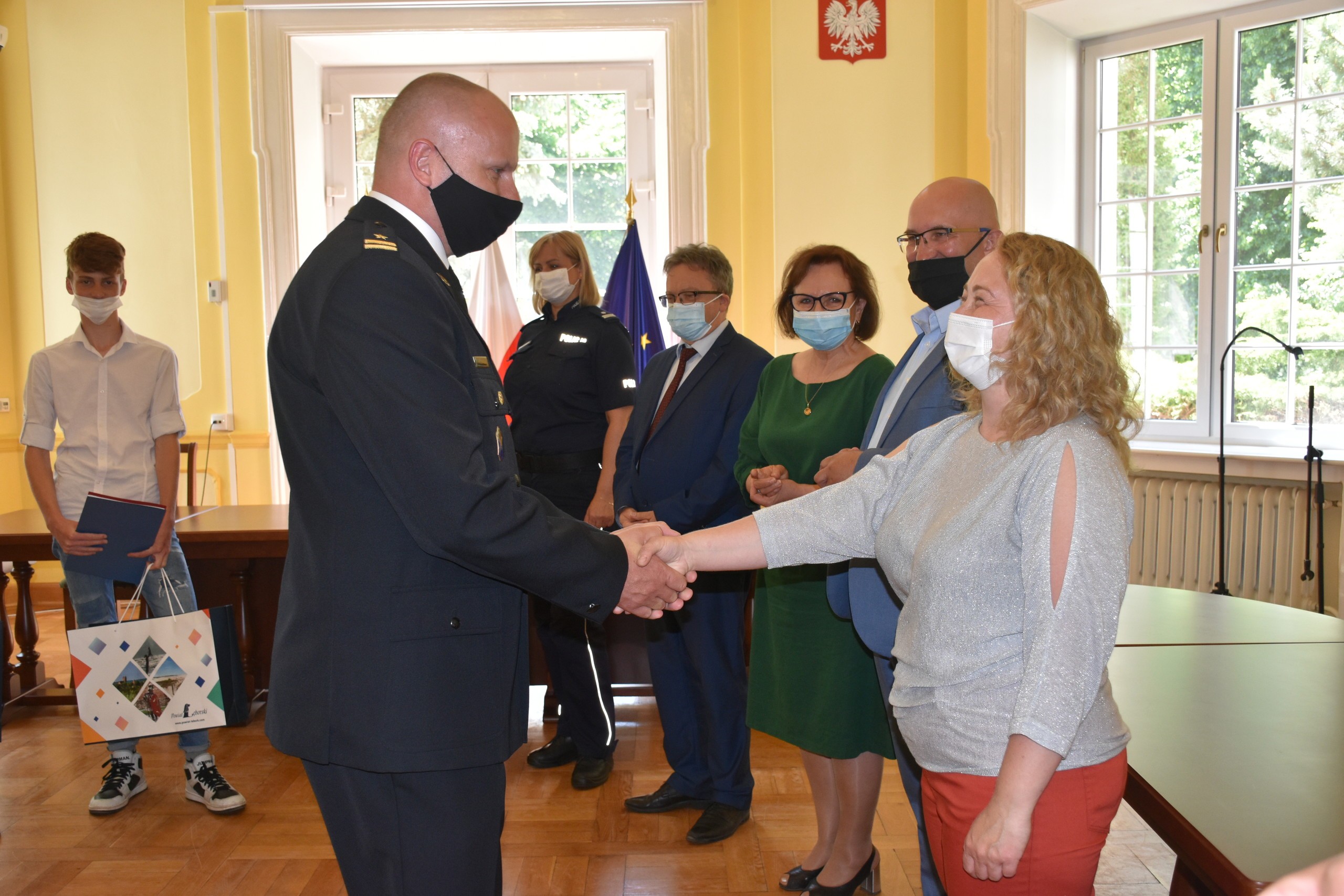 16 czerwca br. Starosta Lęborski Alicja Zajączkowska wraz z Komendantem Komendy Powiatowej Państwowej Straży Pożarnej w Lęborku- mł. bryg. Piotrem Krzemińskim, Komendantem Komendy Powiatowej Policji w Lęborku- nadkom. Mariuszem Mejerem, a także zastępcą – Joanną Kowalik -Kosińską, dyrektorem Powiatowego Centrum Edukacyjnego – Arturem Obolewskim oraz członkami Zarządu Powiatu Lęborskiego: Wicestarostą Edmundem Głombiewskim, Jackiem Perłakiem, Ryszardem Wentą, uhonorowali dwóch braci, który wykazując się bohaterską postawą, w niedzielę 13 czerwca br. uratowali życie trzem topiącym się mężczyznom.