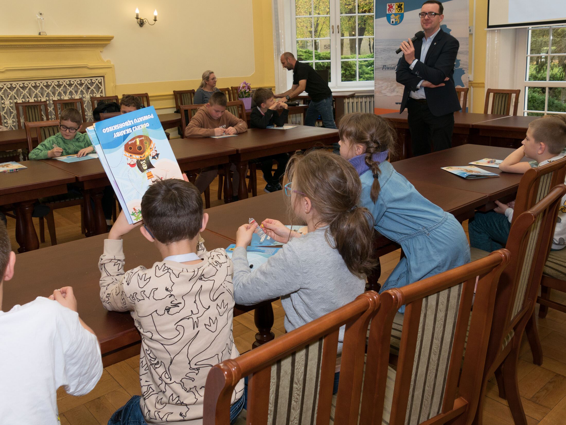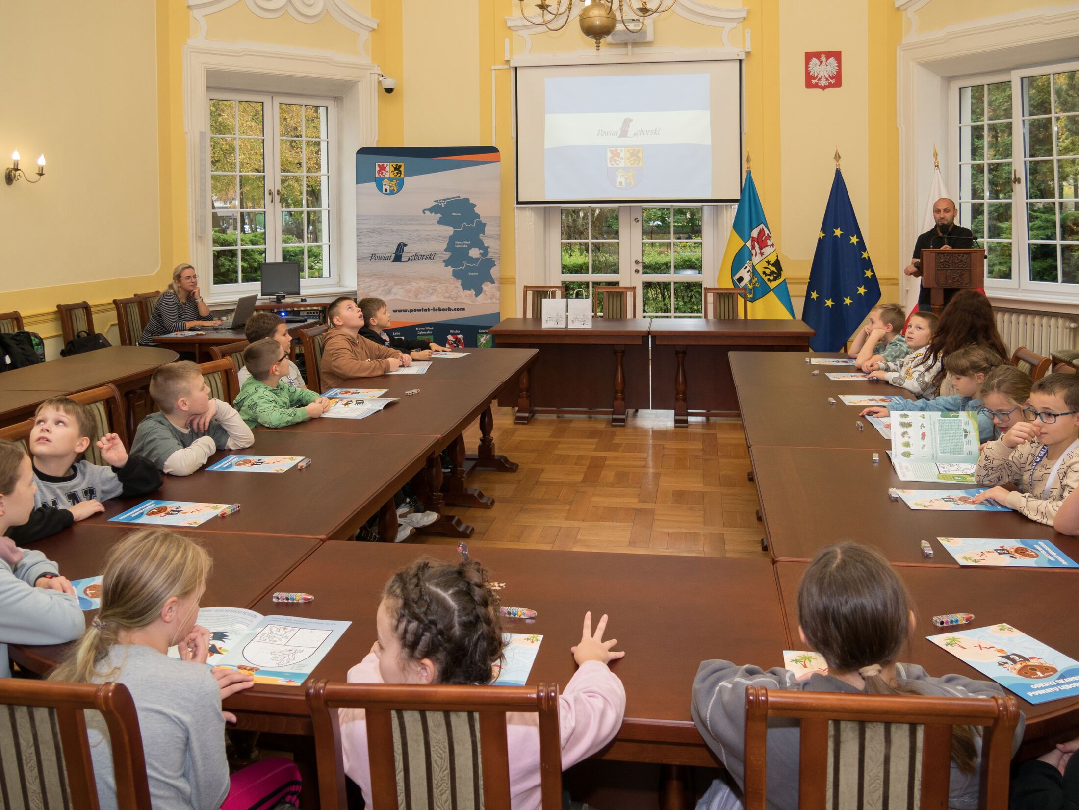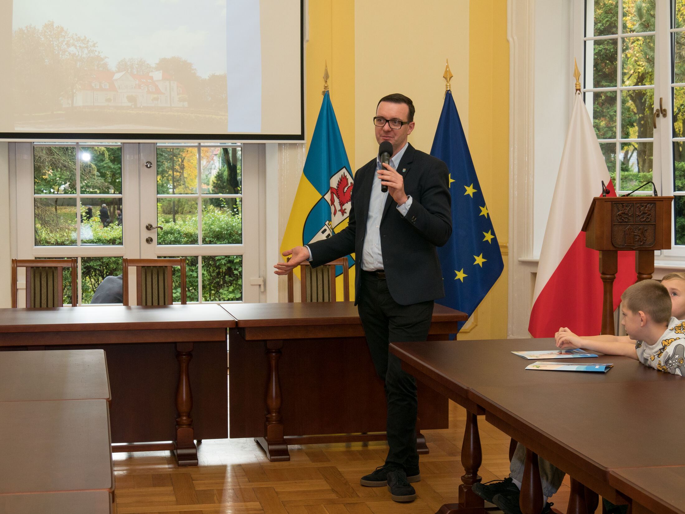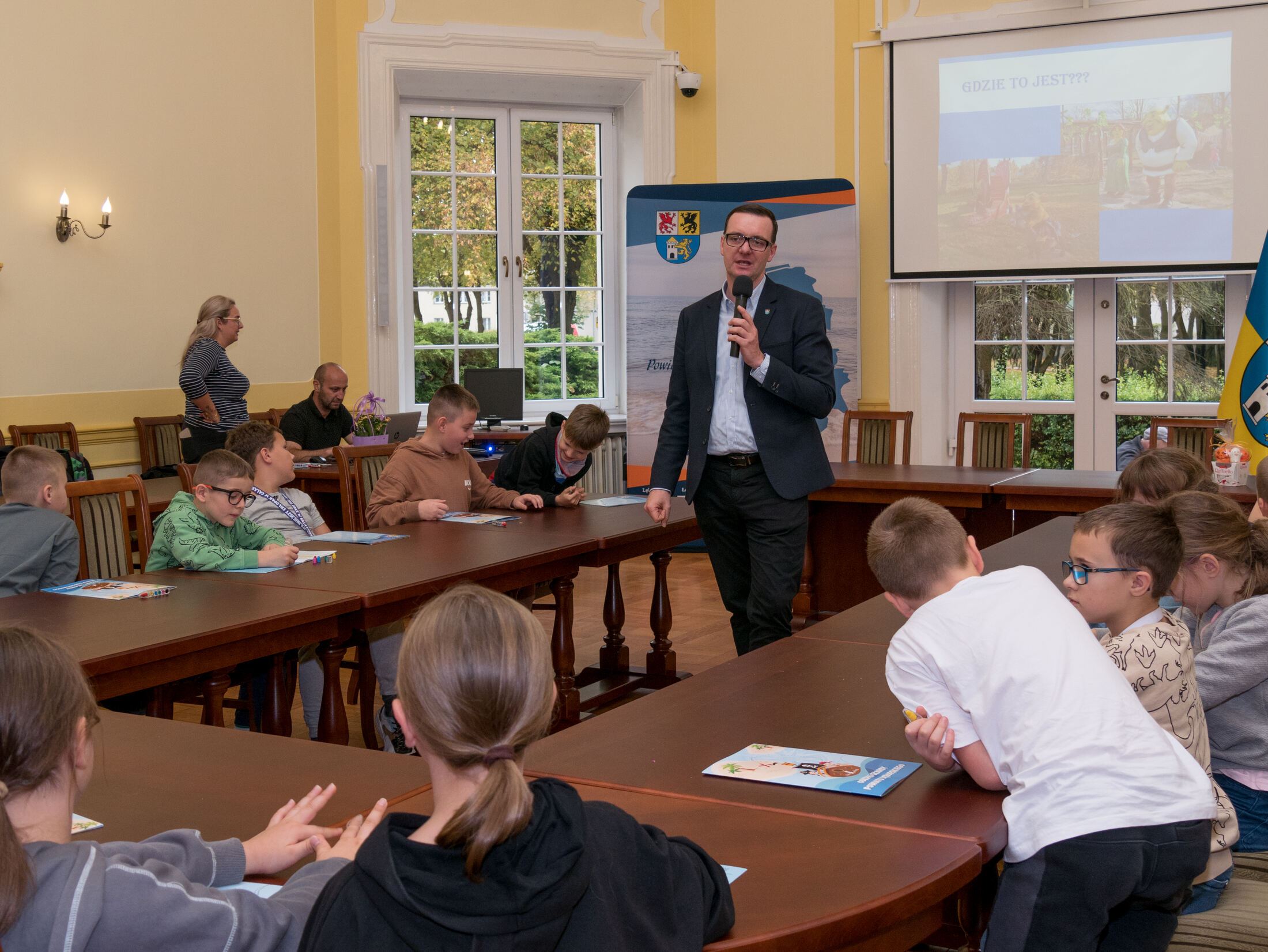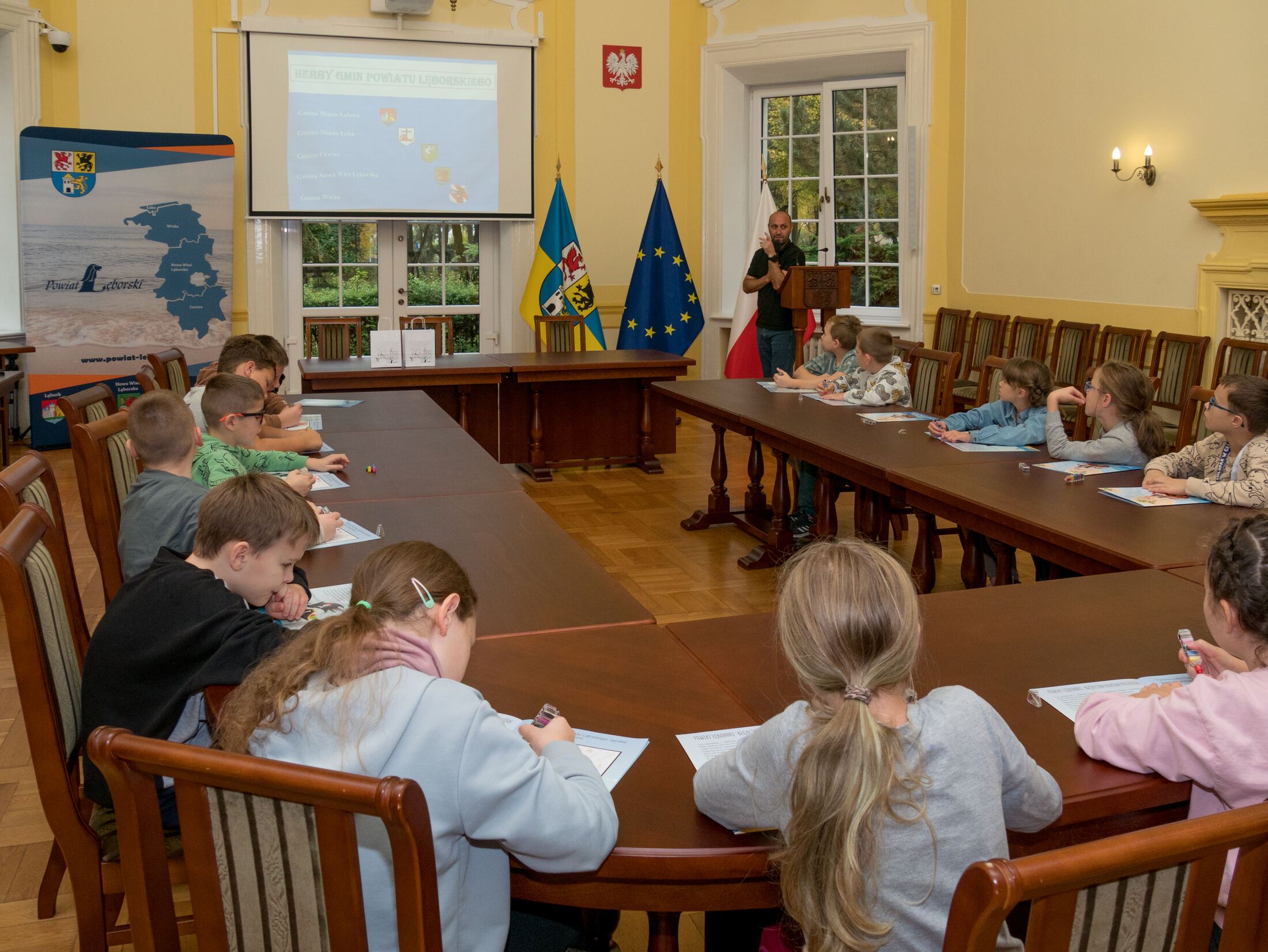Z uczniami spotkał się Krystian Kuczyński z Wydziału Edukacji i Spraw Społecznych, który zaprezentował najciekawsze fakty z historii, których nie dało się opowiedzieć bez nawiązania do funkcjonujących w obiegowej opinii legend związanych z tym miejscem, ale także w skrócie opowiedział co w budynku starostwa może załatwić klient urzędu. Był czas na ciekawostki i charakterystyczne miejsca dla gmin powiatu lęborskiego. Tutaj młodzi goście wykazali się sporą wiedzą, a przede wszystkim aktywnością w quizowej zabawie.