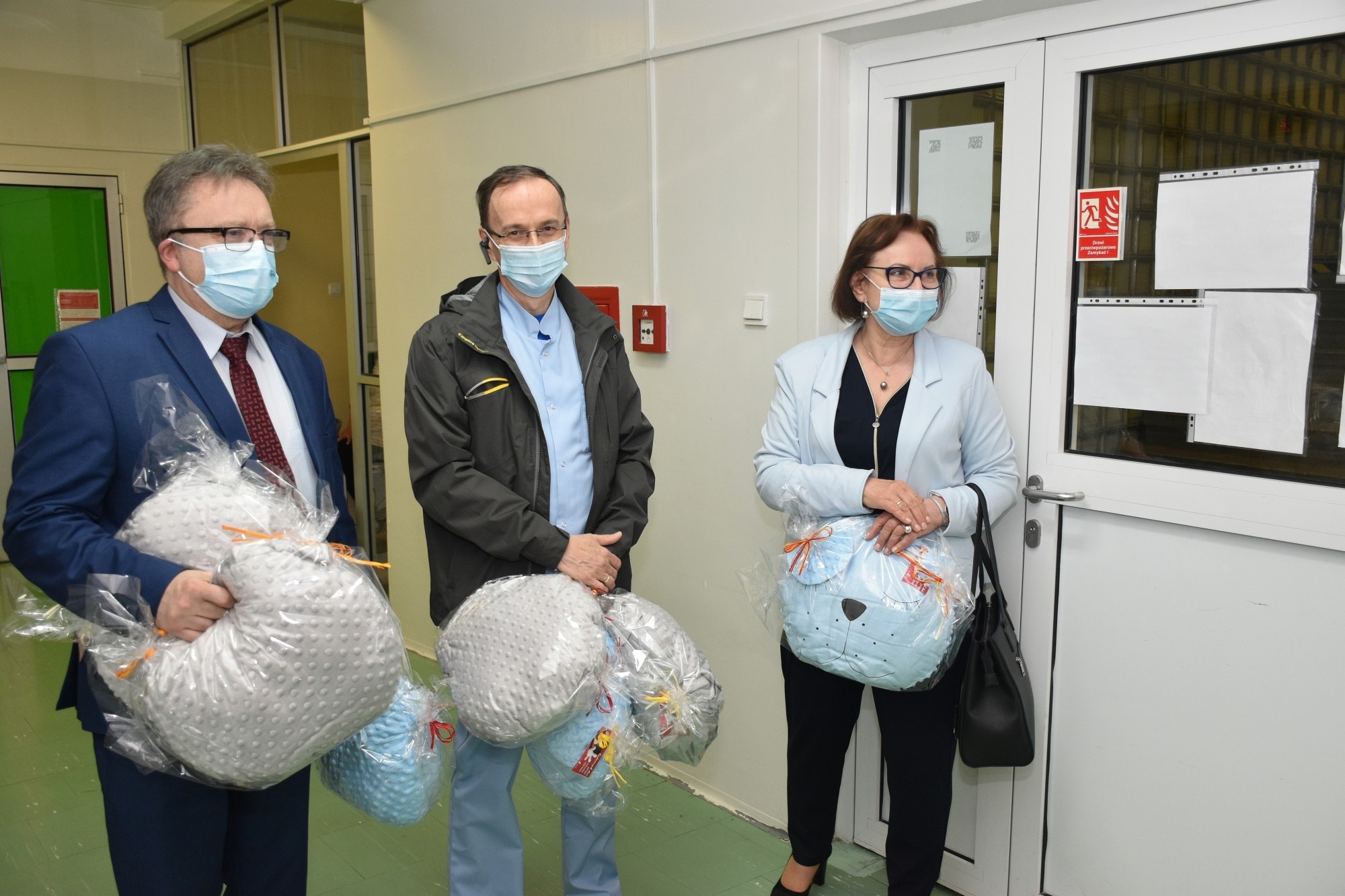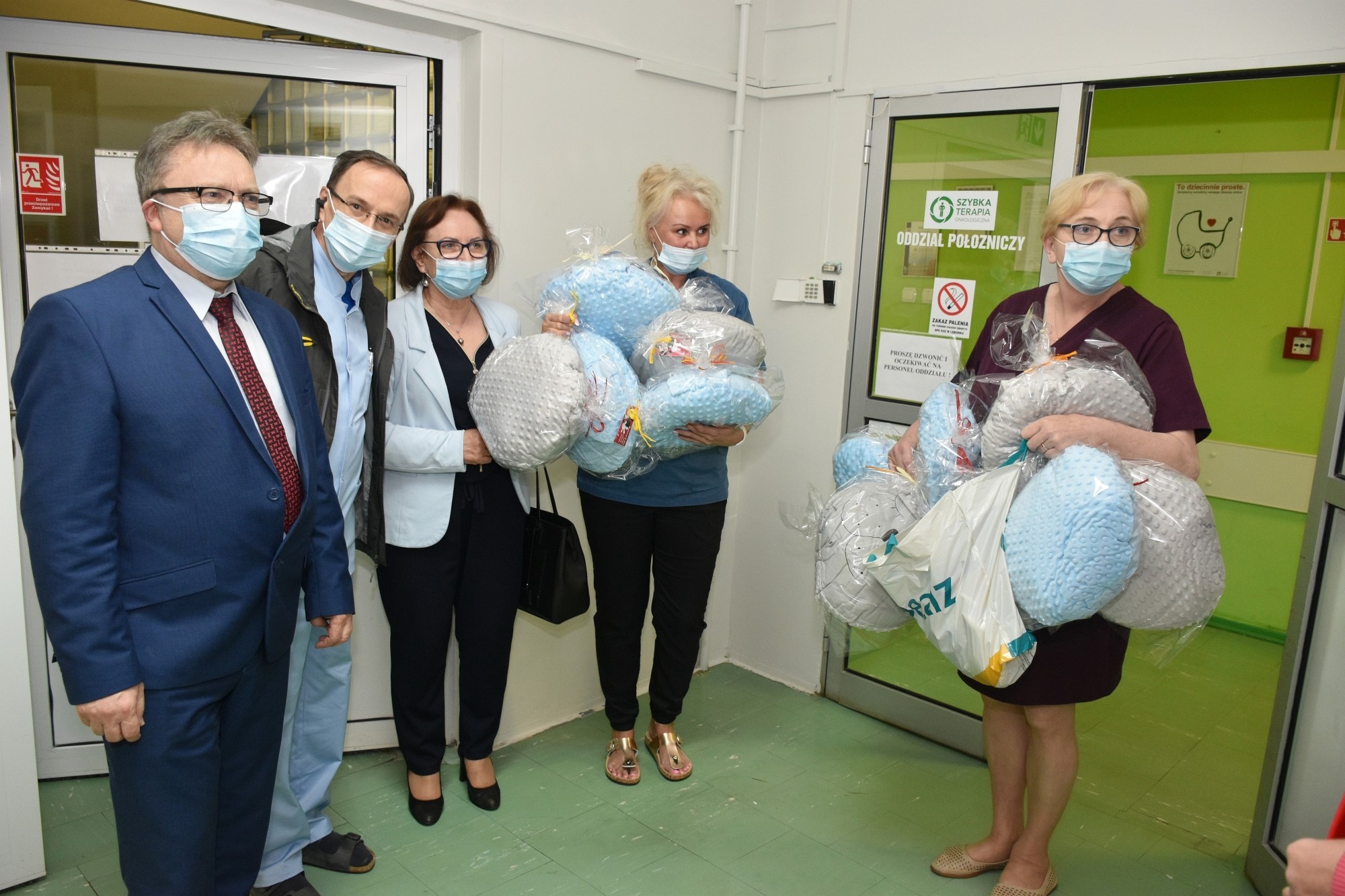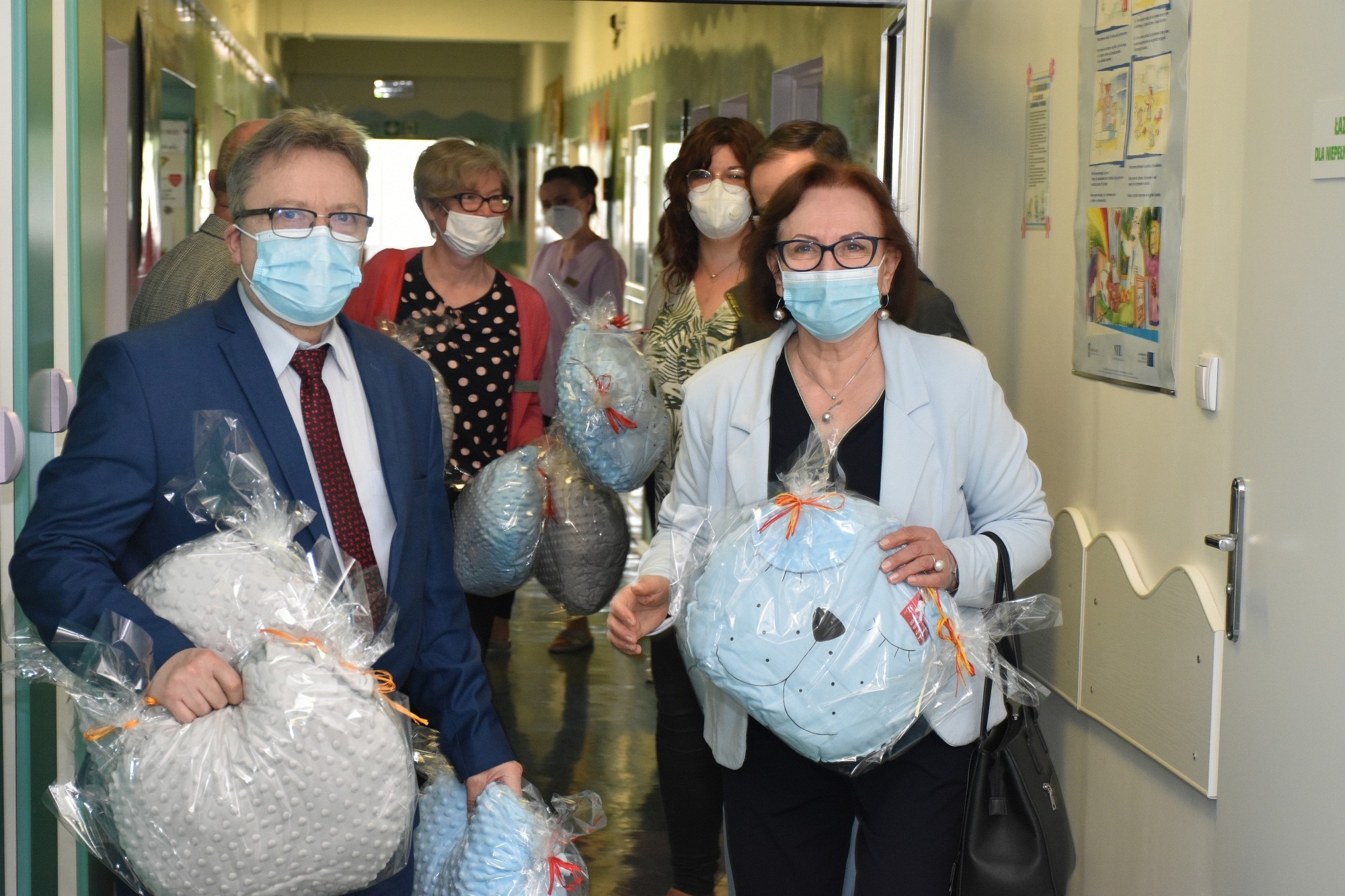 Dzieci przebywające na oddziałach: dziecięcym i neonatologii otrzymały od starostów „misiowe” poduszki, wykonane przez rękodzielników z zaprzyjaźnionego z powiatem lęborskim – powiatu brzeskiego. Mięciutkie przytulanki na pewno choć odrobinę złagodzą czas rozstania z bliskimi, a choć goście nie mogli osobiście przekazać dzieciom upominków, ponieważ czas pandemii jeszcze nie minął i odwiedziny w szpitalu podlegają ograniczeniom, o przekazanie prezentów zadbał personel SPS ZOZ z Arturem Barną, lekarzem naczelnym lęborskiego szpitala, który przywitał starostów w szpitalu. Goście przekazali również puzzle, gry planszowe, klocki, i materiały do rysowania dla dzieci znajdujących się pod opieką Ośrodka Środowiskowej Opieki Psychologicznej i Psychoterapeutycznej Centrum Zdrowia Psychicznego, działającego w strukturze Samodzielnego Publicznego Specjalistycznego Zakładu Opieki Zdrowotnej.