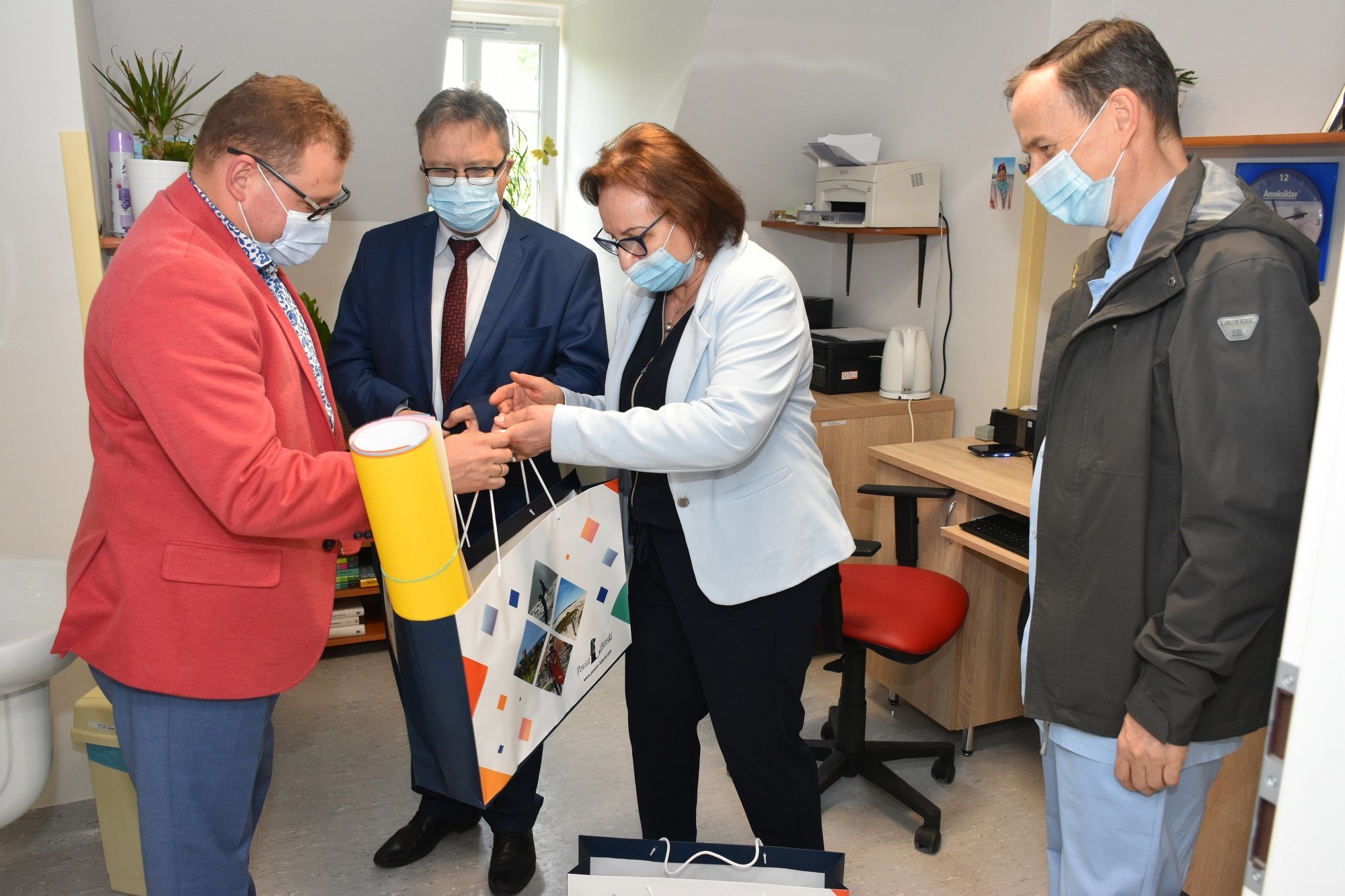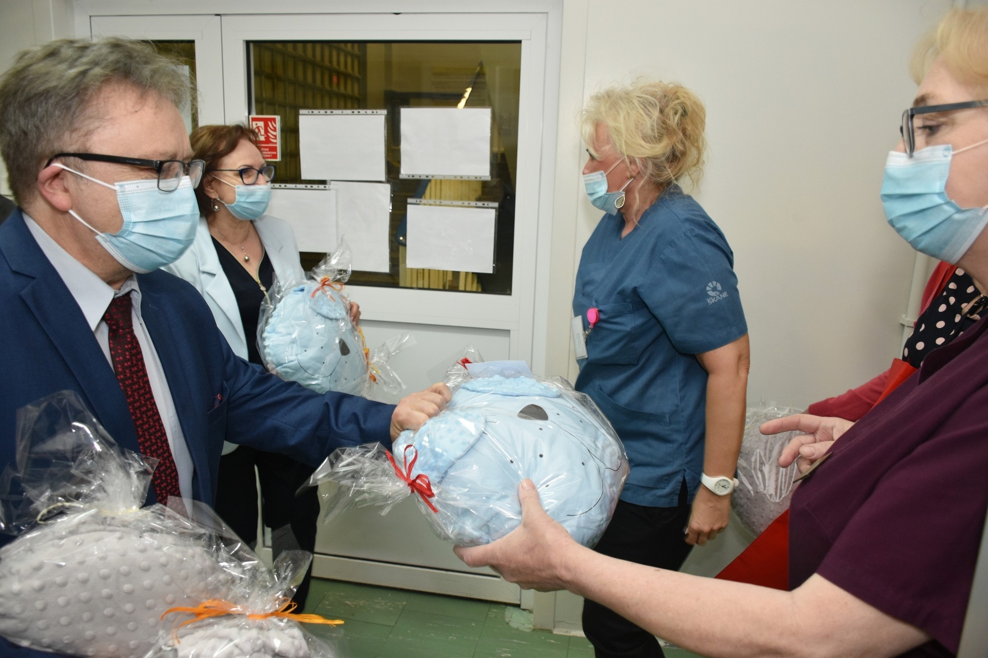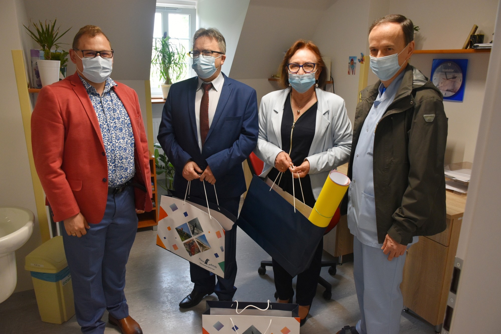 Dzieci przebywające na oddziałach: dziecięcym i neonatologii otrzymały od starostów „misiowe” poduszki, wykonane przez rękodzielników z zaprzyjaźnionego z powiatem lęborskim – powiatu brzeskiego. Mięciutkie przytulanki na pewno choć odrobinę złagodzą czas rozstania z bliskimi, a choć goście nie mogli osobiście przekazać dzieciom upominków, ponieważ czas pandemii jeszcze nie minął i odwiedziny w szpitalu podlegają ograniczeniom, o przekazanie prezentów zadbał personel SPS ZOZ z Arturem Barną, lekarzem naczelnym lęborskiego szpitala, który przywitał starostów w szpitalu. Goście przekazali również puzzle, gry planszowe, klocki, i materiały do rysowania dla dzieci znajdujących się pod opieką Ośrodka Środowiskowej Opieki Psychologicznej i Psychoterapeutycznej Centrum Zdrowia Psychicznego, działającego w strukturze Samodzielnego Publicznego Specjalistycznego Zakładu Opieki Zdrowotnej.