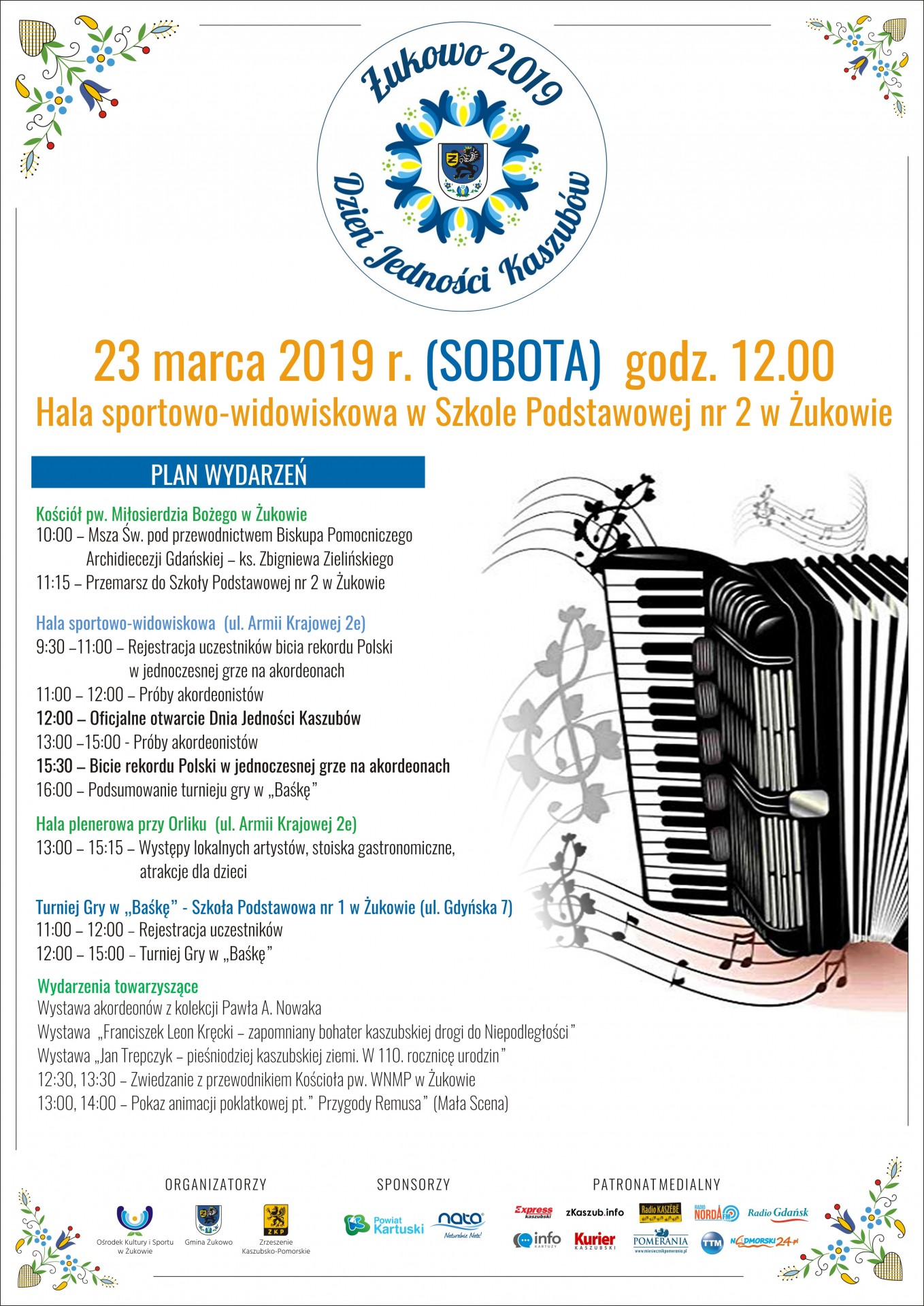 Świętu towarzyszyć będzie szereg wydarzeń. O godz. 12.00 na Hali Widowiskowo-Sportowej w Żukowie (przy Szkole Podstawowej nr 2 w Żukowie) nastąpi oficjalne otwarcie Dnia Jedności Kaszubów. Na zewnątrz powstanie mniejsza hala, gdzie od godz. 13.00 będą miały miejsce występy lokalnych artystów, stoiska gastronomiczne, atrakcje dla dzieci i wiele innych. Również o godz. 13.00 i 14.00 na Małej Scenie odbędzie się pokaz animacji poklatkowej pt. „Przygody Remusa”, a na osoby lubiące historię czeka nie lada gratka - zwiedzanie ponorbertańskiego Kościoła pw. WNMP w Żukowie z przewodnikiem (godz. 12.30, 13.30).