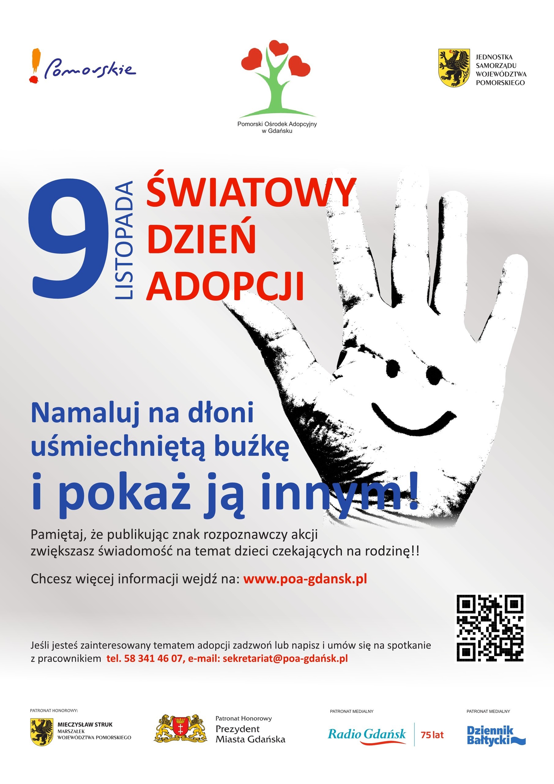 9 listopada obchodzimy Światowy Dzień Adopcji. Rysunek uśmiechniętej buzi na dłoni – to symbol wsparcia tych ważnych działań na rzecz opieki nad dziećmi.