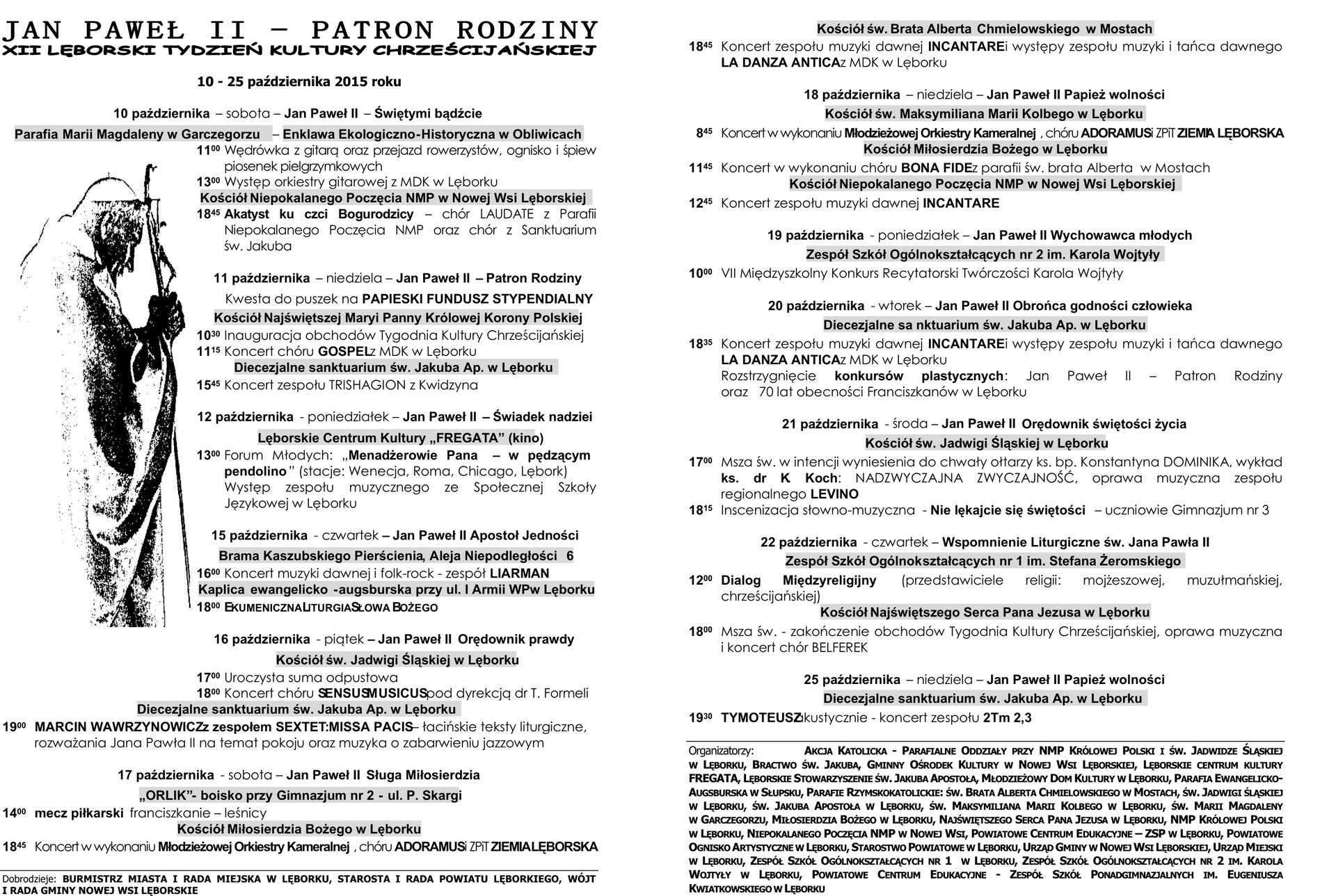 Organizatorzy zapraszają w dniu 12 października (poniedziałek) o godz. 13.00 do Lęborskiego Centrum Kultury „FREGATA” (kino) na Forum Młodych: „Menadżerowie Pana – w pędzącym pendolino” (stacje: Wenecja, Roma, Chicago, Lębork). Występ zespołu muzycznego ze Społecznej Szkoły Językowej w Lęborku.