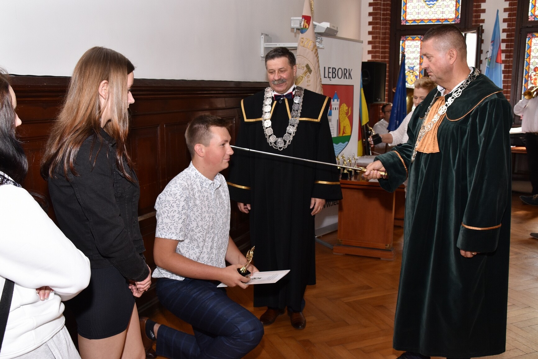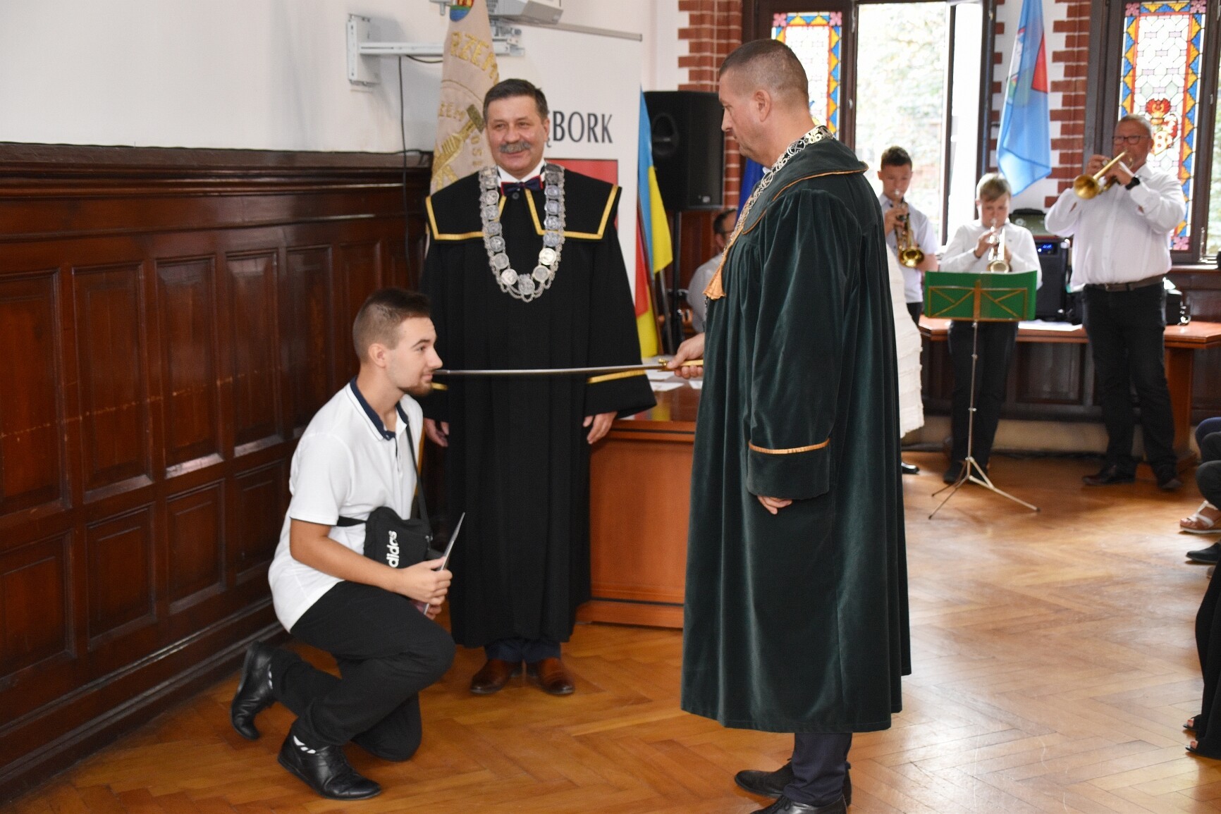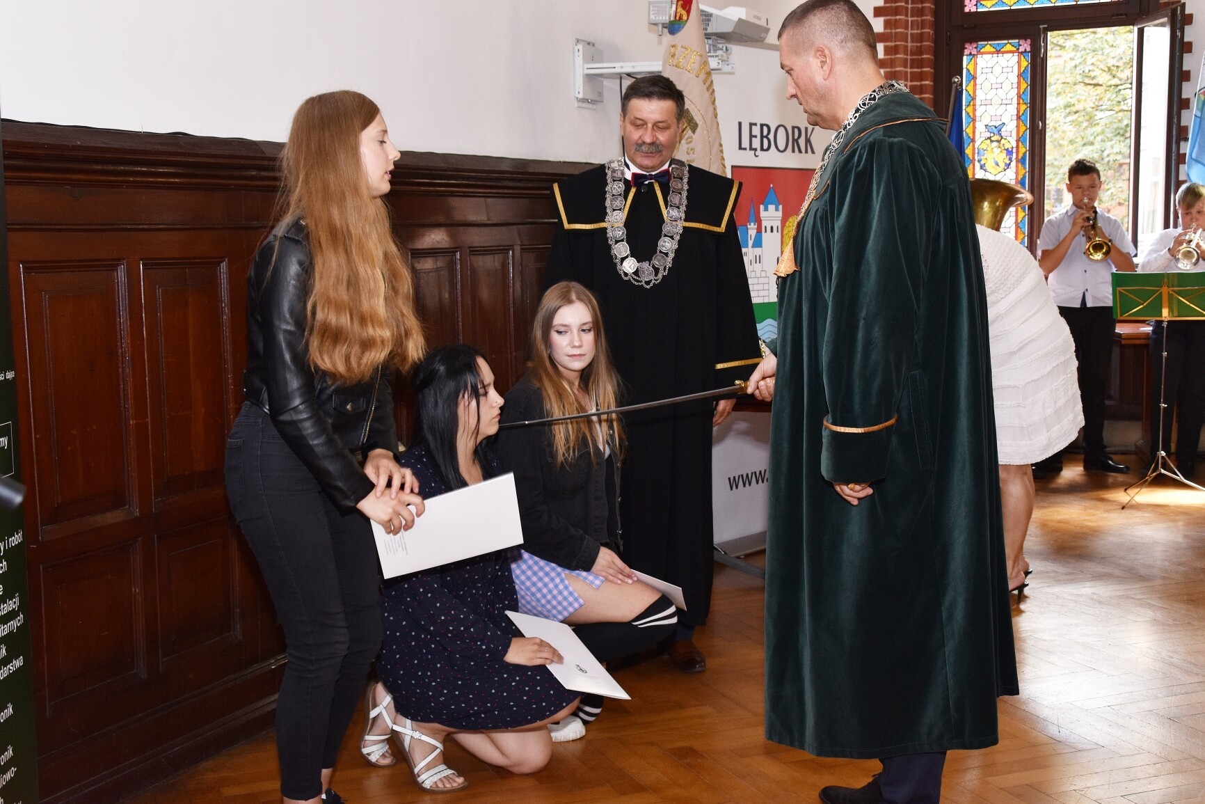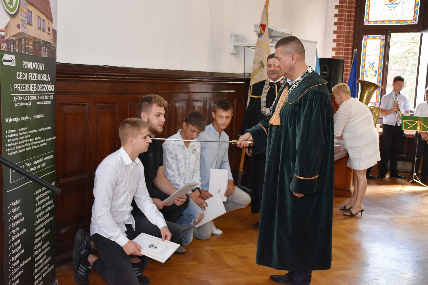 Wśród gości w wypełnionej po brzegi reprezentacyjnej Sali Ratusza znaleźli się: Alicja Zajączkowska – Starosta Lęborski, Witold Namyślak – burmistrz Lęborka wraz z zastępcami, Artur Obolewski – dyrektor Powiatowego Centrum Edukacyjnego oraz reprezentanci zarządu Cechu Rzemiosła i przedsiębiorczości, a także Jan Gański, Prezes i Przewodniczący Rady Izby Rzemiosła i Przedsiębiorczości Pomorza Środkowego w Słupsku. Dokumenty potwierdzające czeladnicze przygotowanie wręczał starszy cechu w Lęborku Roman Chmielewski. Prezes Gański dopełnił ceremoniału poprzez pasowanie każdego z adeptów rzemiosła Szablą Kilińskiego.