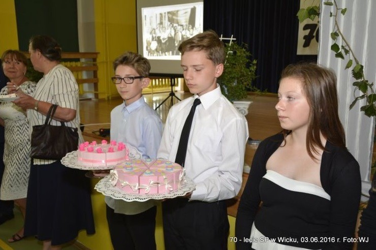 Na każdego z przybyłych na salę gości czekały również kolejne pamiątkowe niespodzianki oraz tort upieczony przez Piekarnię Głodowski z okazji siedemdziesiątych urodzin szkoły.Obchody jubileuszu siedemdziesięciolecia Szkoły Podstawowej w Wicku - część 2.