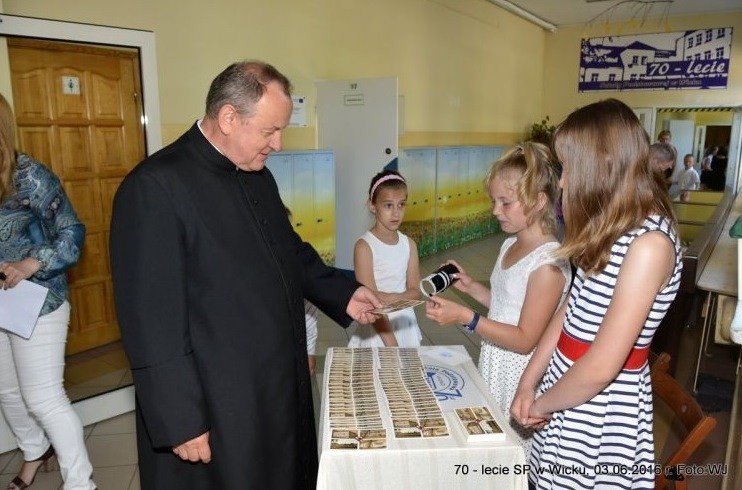 Na holu głównym zaproszeni goście mogli wpisywać się do księgi pamiątkowej, otrzymać upominki wraz ze specjalną pieczęcią z okazji 70-lecia SP Wicko oraz zobaczyć zgromadzone pamiątki z dawnych szkolnych lat, a także obejrzeć wystawę poświęconą minionym dziesięcioleciom działalności Szkoły Podstawowej w Wicku.