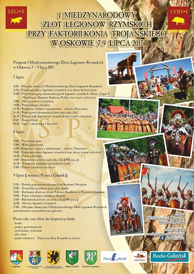 W dniach 7-9 lipca br na terenie Faktorii Rzymskiej Koń Trojański w Oskowie koło Cewic, odbędzie się I Międzynarodowy Zlot Legionów Rzymskich. Przybędą legiony z Polski i z zagranicy - Rumunii, Rosji, Białorusi i Niemiec. Na miejscu będzie można poznać życie obozowe legionistów, formacje bojowe, umundurowanie, sprzęt i wiele innych atrakcji.