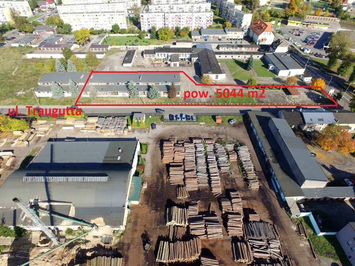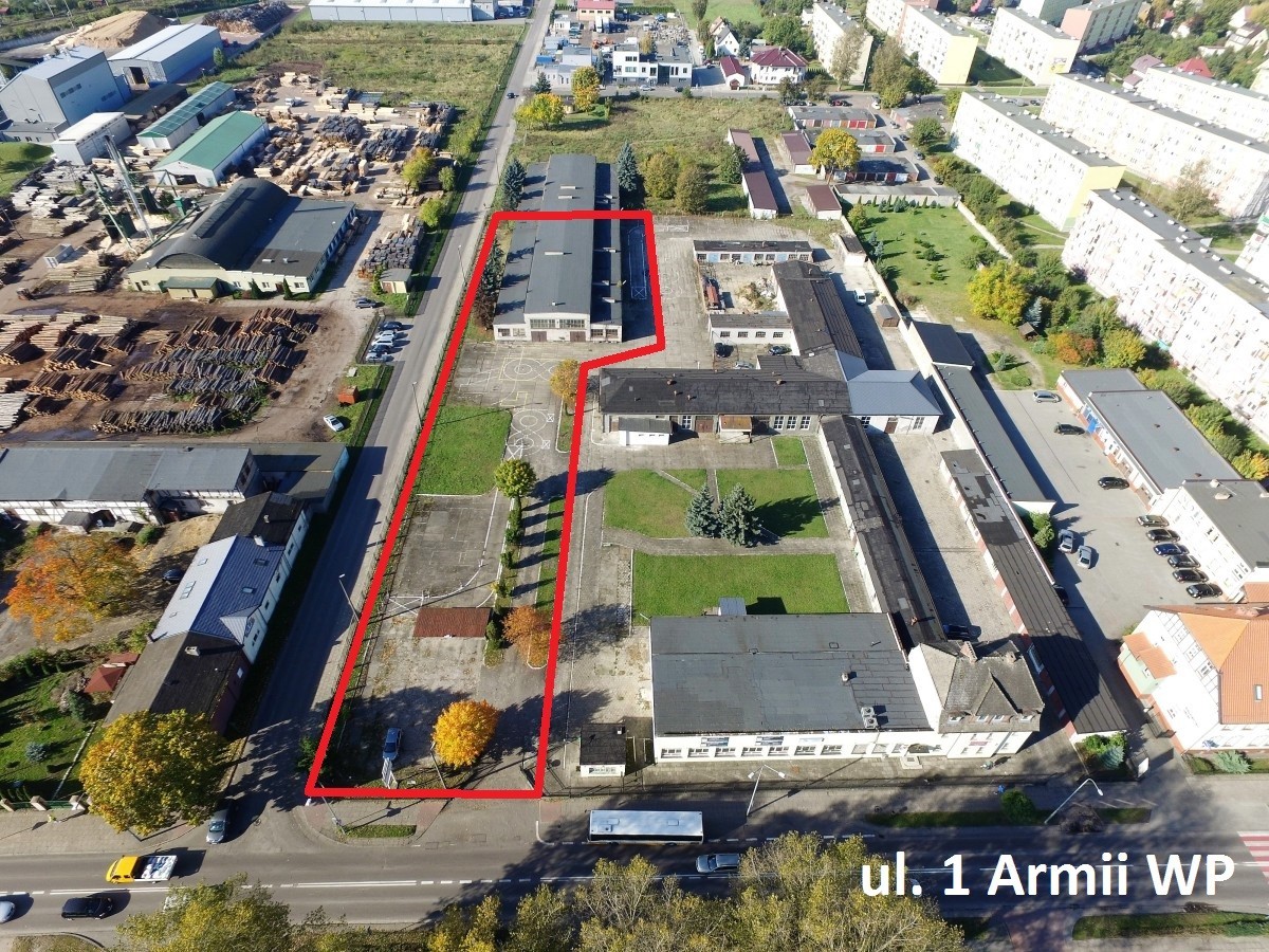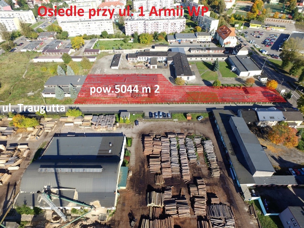 Działka zabudowana położona przy ulicy Traugutta oraz I Armii Wojska Polskiego w pobliżu centrum miasta. Na terenie nieruchomości posadowiony jest budynek hali warsztatowej o powierzchni 1370 m2. Działka częściowo ogrodzona wraz z utwardzonym terenem pod parking oraz plac manewrowy dla samochodów ciężarowych. Teren płaski. Dojazd do nieruchomości od ulicy I Armii Wojska Polskiego. Uzbrojenie terenu: wodociąg, kanalizacja, energia elektryczna, ciepłociąg.