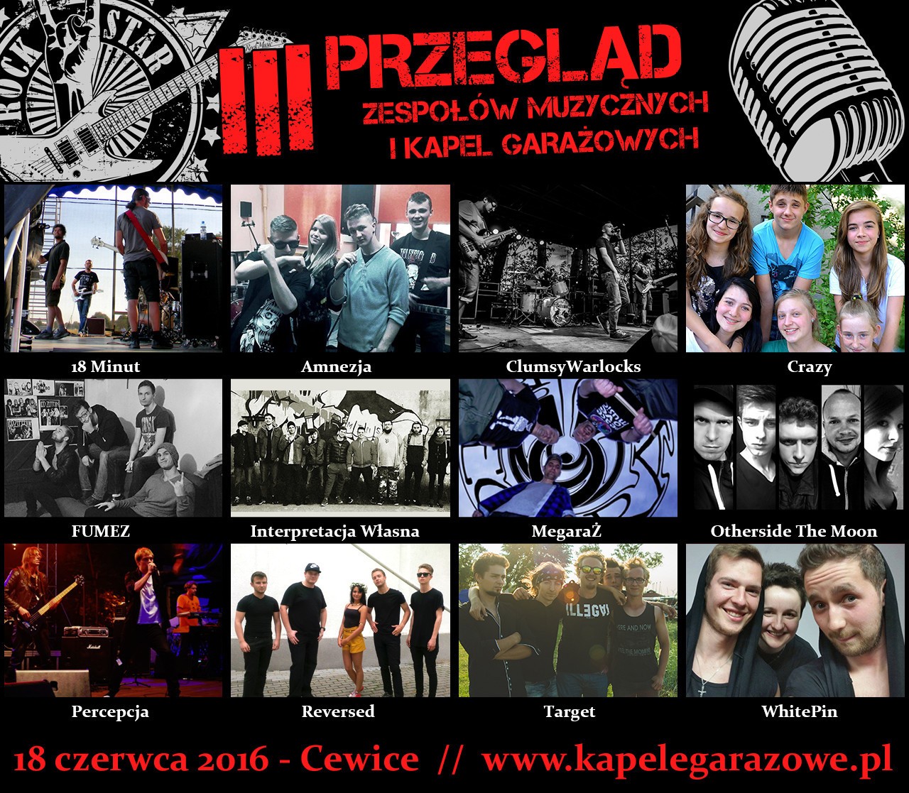 Zespoły, które zobaczymy i usłyszymy w Cewicach: 18 Minut (Morąg), Amnezja (Nowa Wieś Lęborska - dzika karta), ClumsyWarlocks (Tarnowskie Góry), Crazy (Człuchów), FUMEZ (Elbląg), Interpretacja Własna (Bobolice), MegaraŻ (Grudziądz), Otherside The Moon (Lębork - dzika karta), Percepcja (Wejherowo), Reversed (Gdynia), Target (Pomorze) oraz WhitePin (Słupsk).