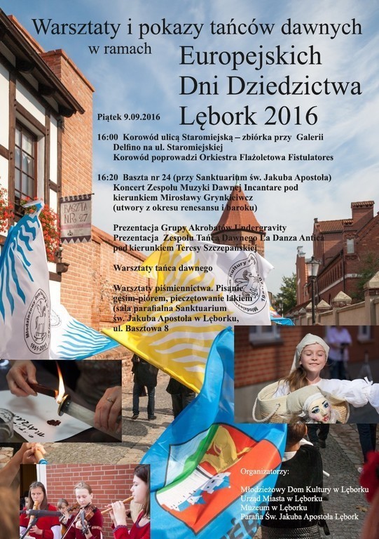 Imprezą towarzyszącą Europejskim Dniom Dziedzictwa w Lęborku będą „Warsztaty i pokazy tańców dawnych” oraz warsztaty z średniowiecznego piśmiennictwa i pieczętowania lakiem organizowane przez Młodzieżowy Dom Kultury wraz z Urzędem Miejskim w Lęborku, Muzeum, oraz Parafią Św. Jakuba Apostoła. Start imprezy 9 września br. o godz. 16 przy Galerii Delfino (ul. Staromiejska).