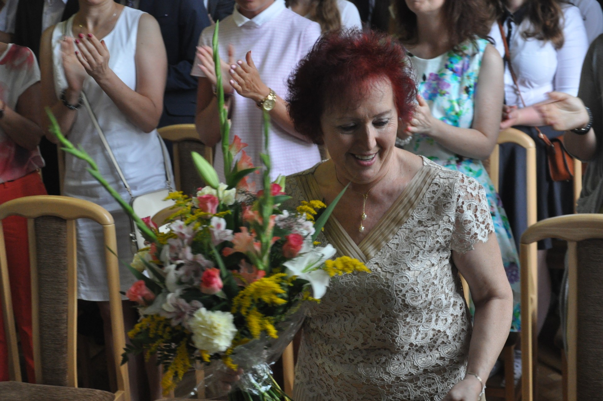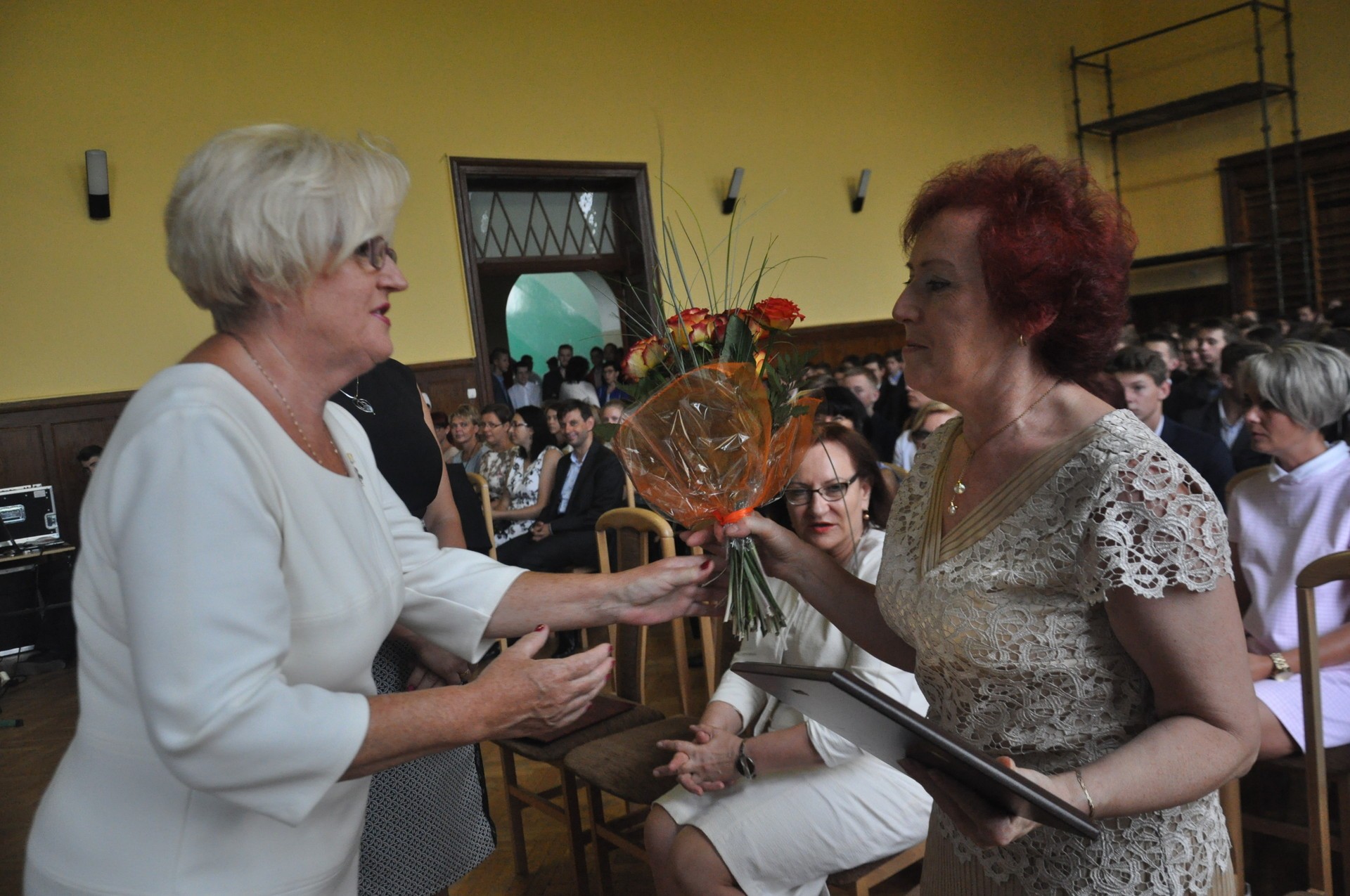 Podczas uroczystości, Pani starosta wręczyła dyrektorom szkół symboliczne kwiaty. Pani Maria Zielonka odchodząca na emeryturę, w dowód uznania i wdzięczności za wieloletnią, pełną zaangażowania i efektywną pracę na stanowisku sekretarza szkoły Zespołu Szkół Ogólnokształcących nr 1 w Lęborku otrzymała okolicznościowy grawerton.
