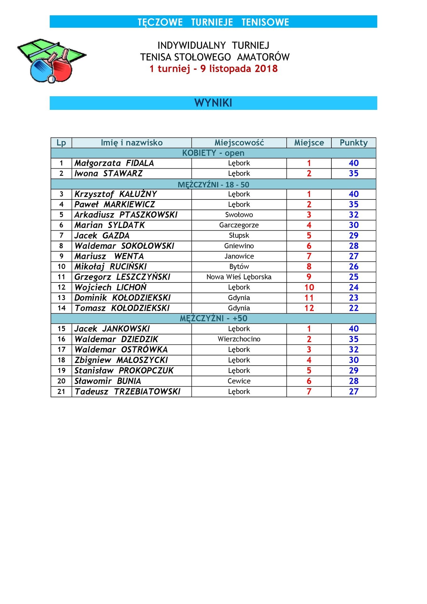 - Indywidualny Turniej Tenisa Stołowego Amatorów - 9 listopada 2018 - wyniki etapu 1