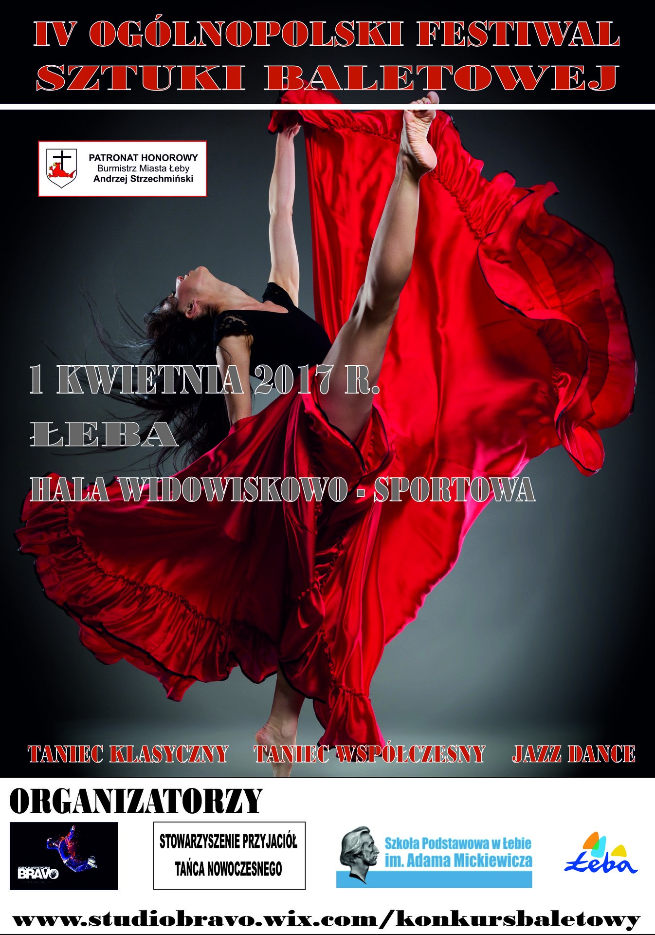 1 kwietnia br. na hali sportowej szkoły podstawowej im. Adama Mickiewicza w Łebie odbędzie się IV Ogólnopolski Festiwal Sztuki Baletowej. Tego dnia będziemy mogli zobaczyć setki młodych tancerzy w różnych kategoriach: taniec klasyczny, taniec współczesny oraz Jazz Dance. Organizatorem festiwalu jest Agencja Artystyczna BRAVO z Lęborka oraz Gmina Miejska Łeba.