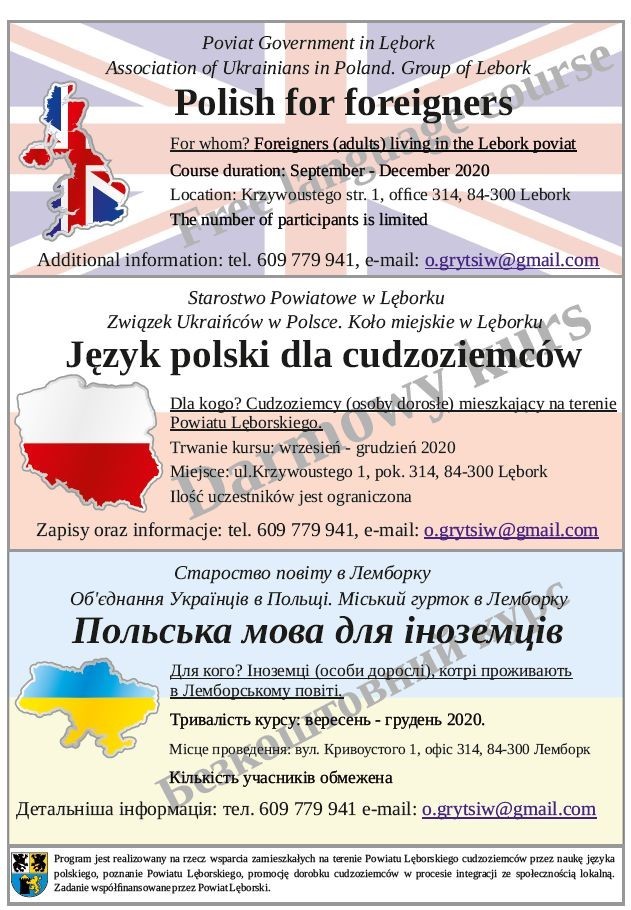 Związek Ukraińców w Polsce Koło miejskie w Lęborku organizuje bezpłatny kurs języka polskiego dla cudzoziemców mieszkających na terenie Powiatu Lęborskiego.