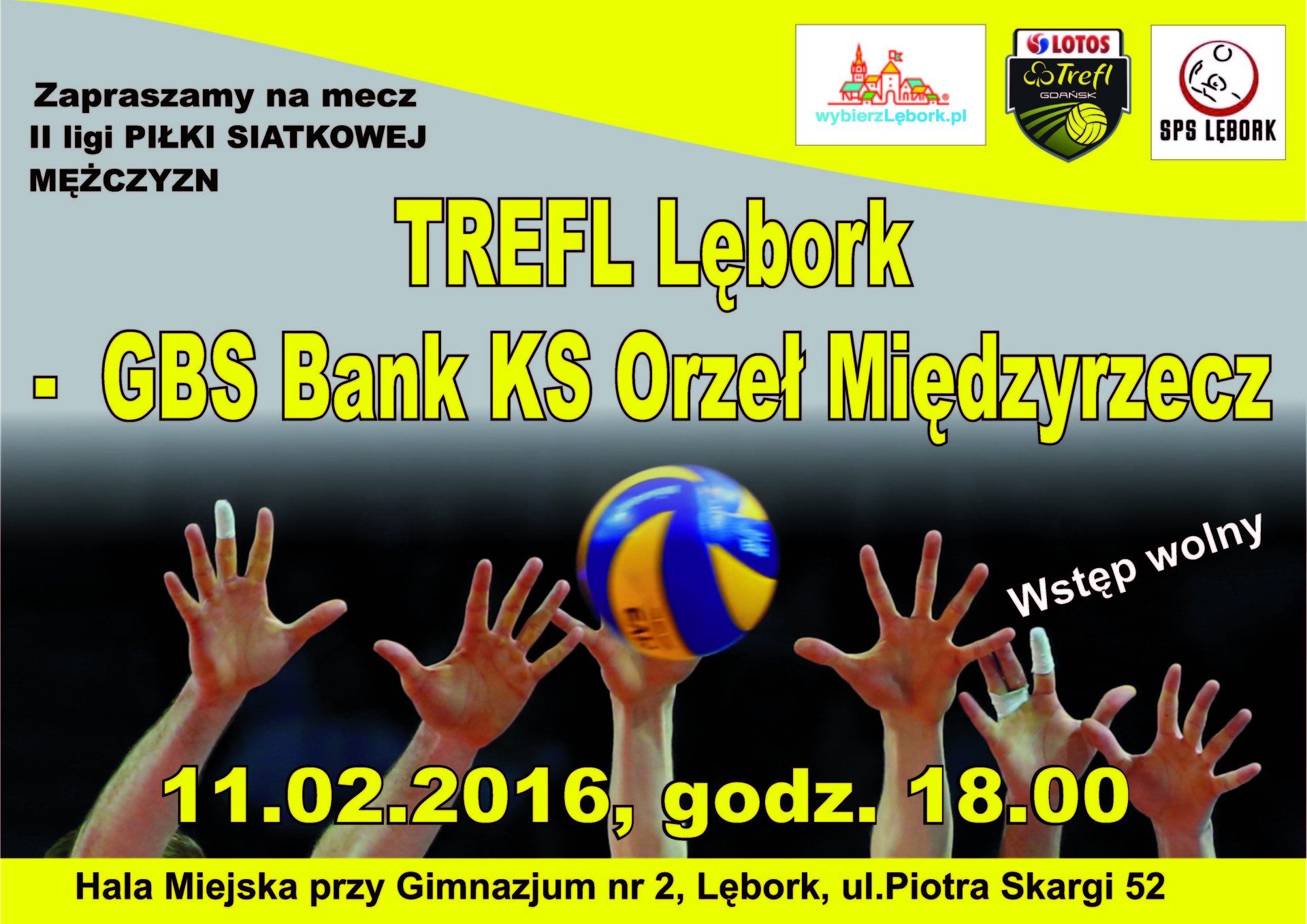 11 lutego 2017 r. , godz. 18:00, mecz II ligi siatkówki mężczyzn sezon 2016/2017 rozegra Trefl Lębork. Na Hali Miejskiej w Lęborku ul. P. Skargi 52 gospodarze będą podejmowali GBS Bank KS Orzełm Międzyrzecz. Wstęp wolny. Serdecznie Zapraszamy.