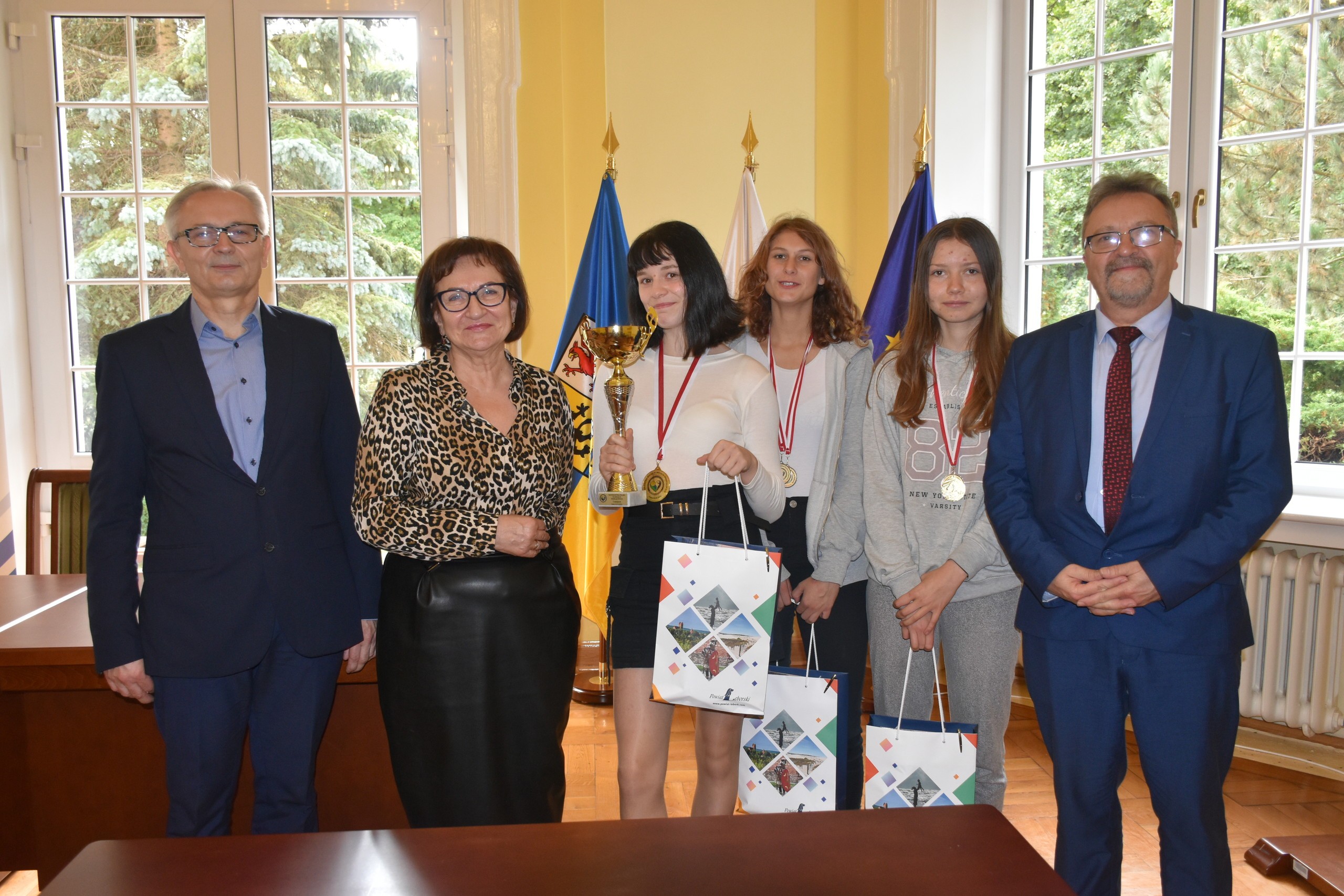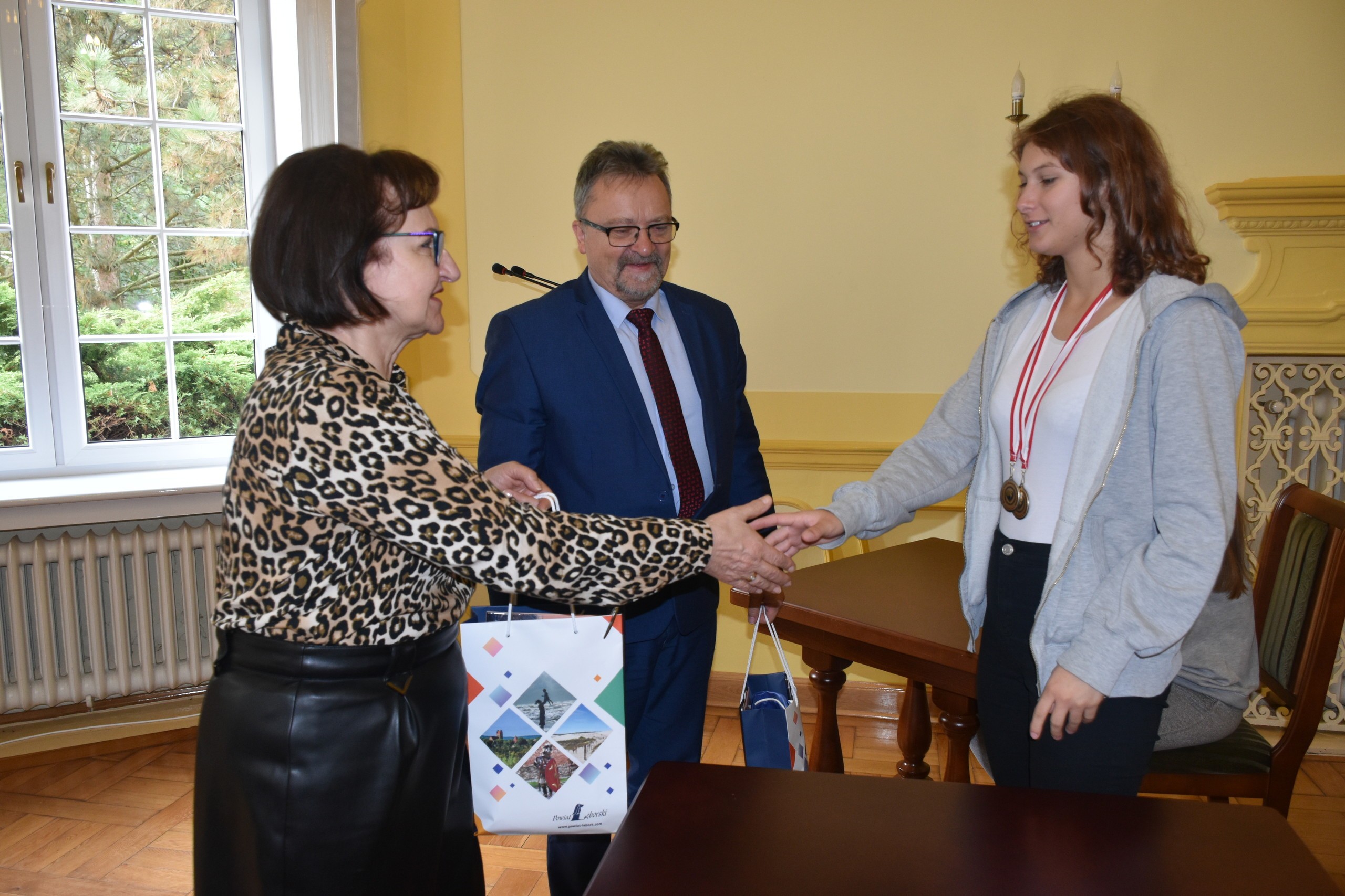 Uczennice Specjalnego Ośrodka Szkolno-Wychowawczego w Lęborku, po udziale w Mistrzostwach Polski w biegach przełajowych w Łosicach, zasiliły zbory medalowe placówki. Pierwszy, złoty, na Mistrzostwach Polski ZSS SPRAWNI – RAZEM w Biegach Przełajowych w Łosicach, w kategorii dziewcząt młodszych zdobyła Julia Kikhia. W tej samej konkurencji, na mecie była także Paulina Freitag. W kategorii dziewcząt starszych Aleksandra Kuch uplasowała się na 6 miejscu, a 7 zajęła Magdalena Szymańska. Jak wspomniał trener Leszek Leciejewski, trasa biegu nie należała do łatwych. Warunki pogodowe sprawiły, że z wielu miejscach było błoto i kałuże, mimo to uczennice pokazały ducha rywalizacji i to im się opłaciło. Tak doskonałe wyniki dziewczyn mogą świadczyć tylko o świetnym przygotowaniu przez trenera – wspomniała podczas wtorkowego spotkania w Starostwie (12.10.2021 r.), Starosta Alicja Zajączkowska. Cieszymy się ogromnie z każdego sukcesu i wierzymy, że podobnych okazji do świętowania będzie jeszcze wiele – nadmienił Wicestarosta Edmund Głombiewski.