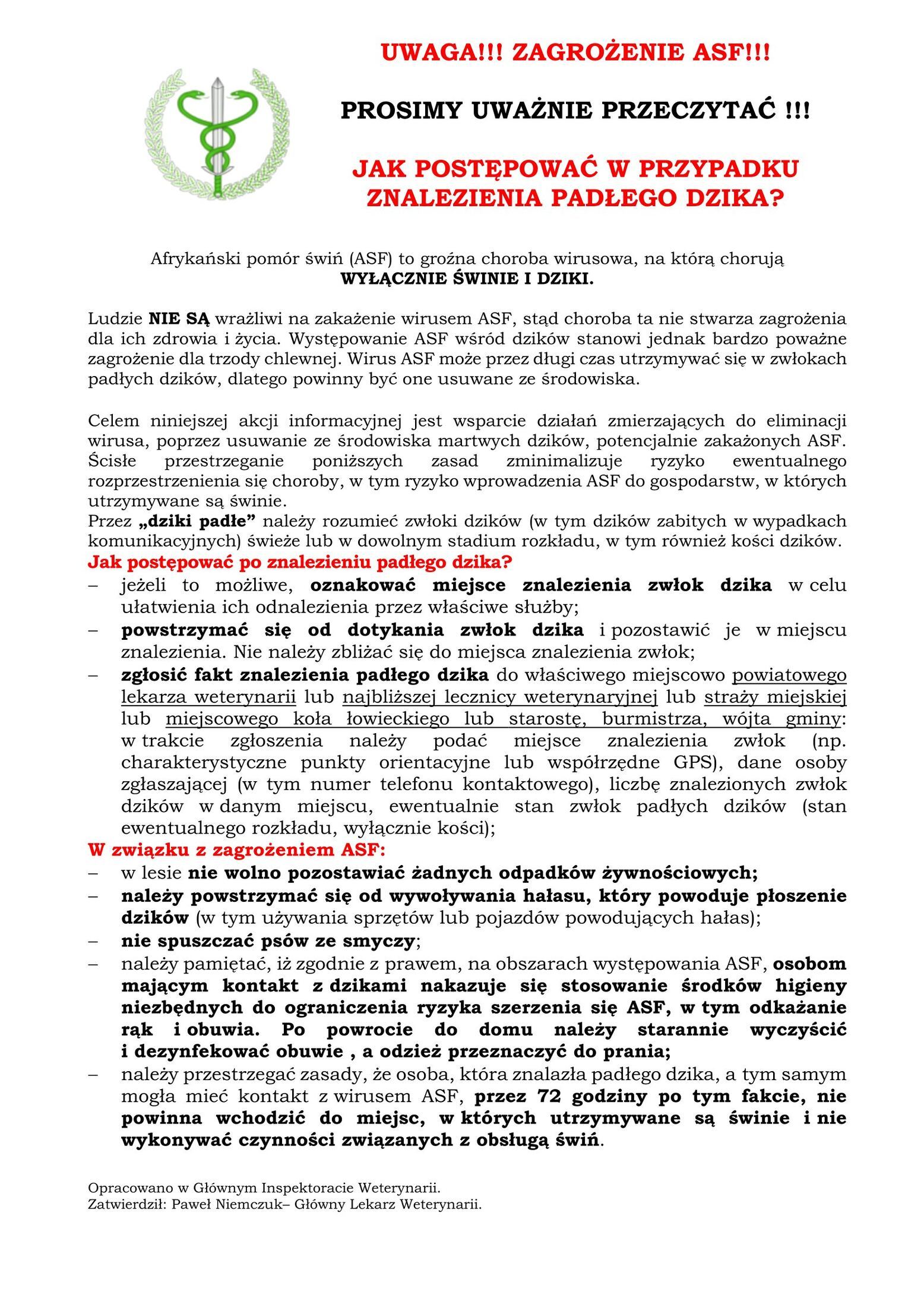 Mając na uwadze dynamiczny rozwój sytuacji, załączamy ulotkę z wytycznymi jak należy postępować w przypadku znalezienia padłego dzika.