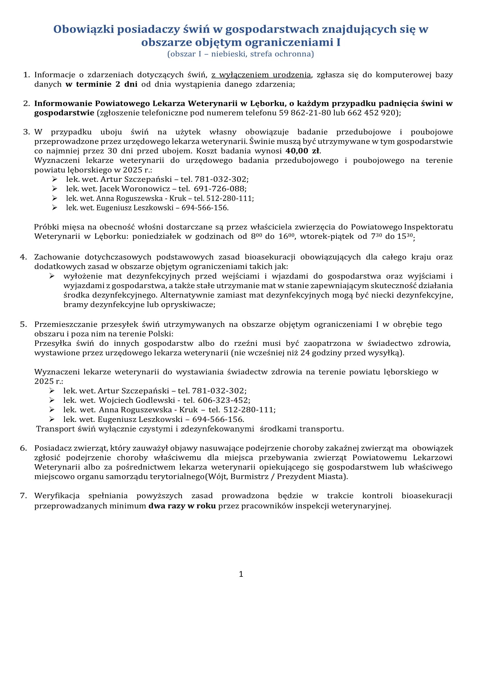 Z uwagi na powyższe przypominamy w załączonych materiałach o obowiązkach posiadaczy świń w gospodarstwach znajdujących się w obszarach objętym ograniczeniami I i II.