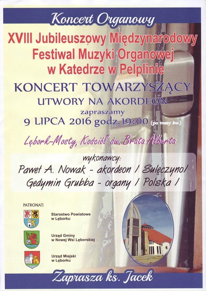 Parafia św. Brata Alberta zaprasza na koncert towarzyszący w ramach Międzynarodowego Festiwalu Muzyki Organowej w Pelplinie, który odbędzie się 9 lipca (sobota) o godz. 19.00 w Mostach.