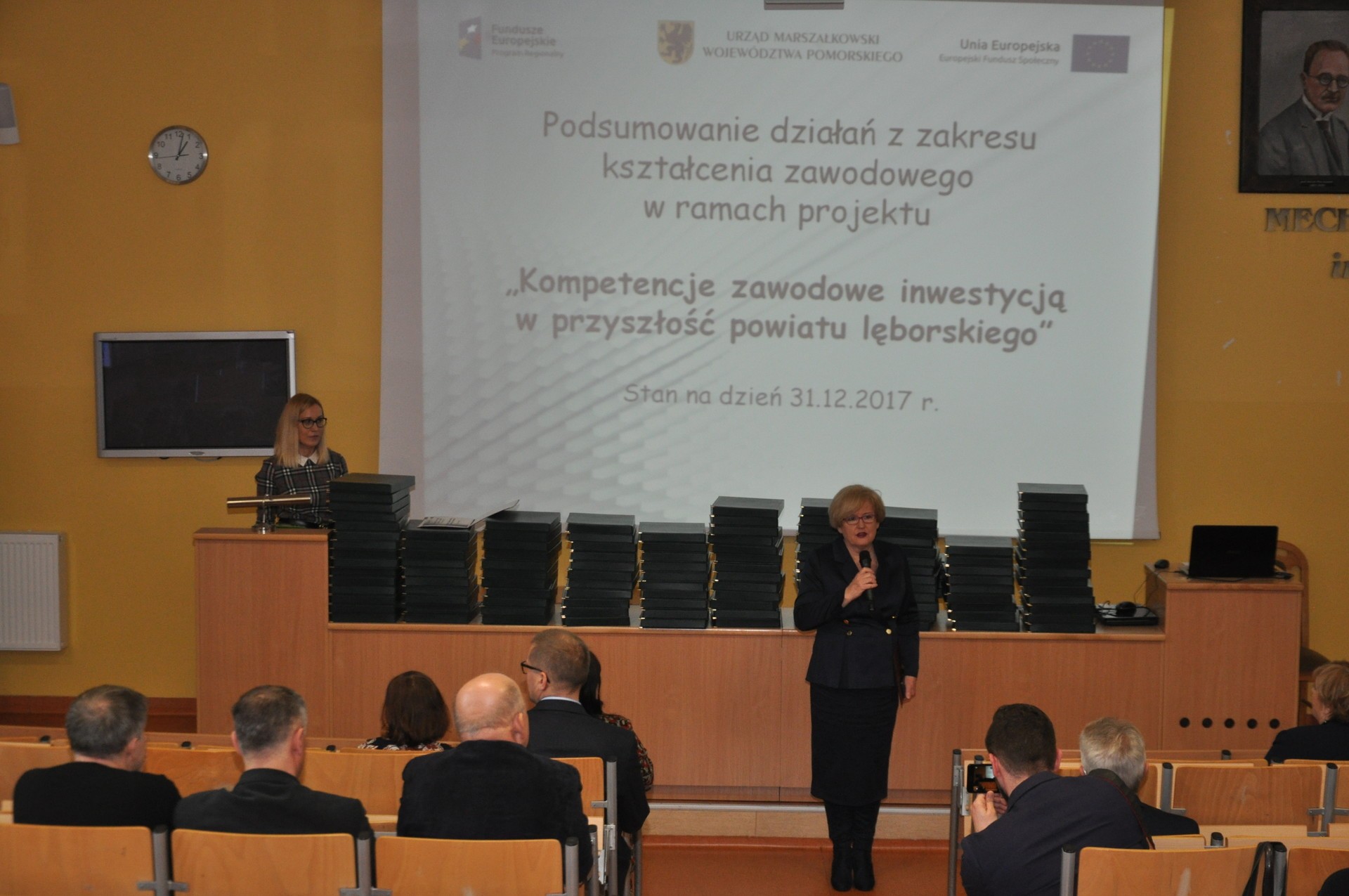 Pani Katarzyna Miłosz koordynator projektu "Kompetencje zawodowe inwestycją w przyszłość powiatu lęborskiego" zaprezentowała podsumowanie działań projektowych