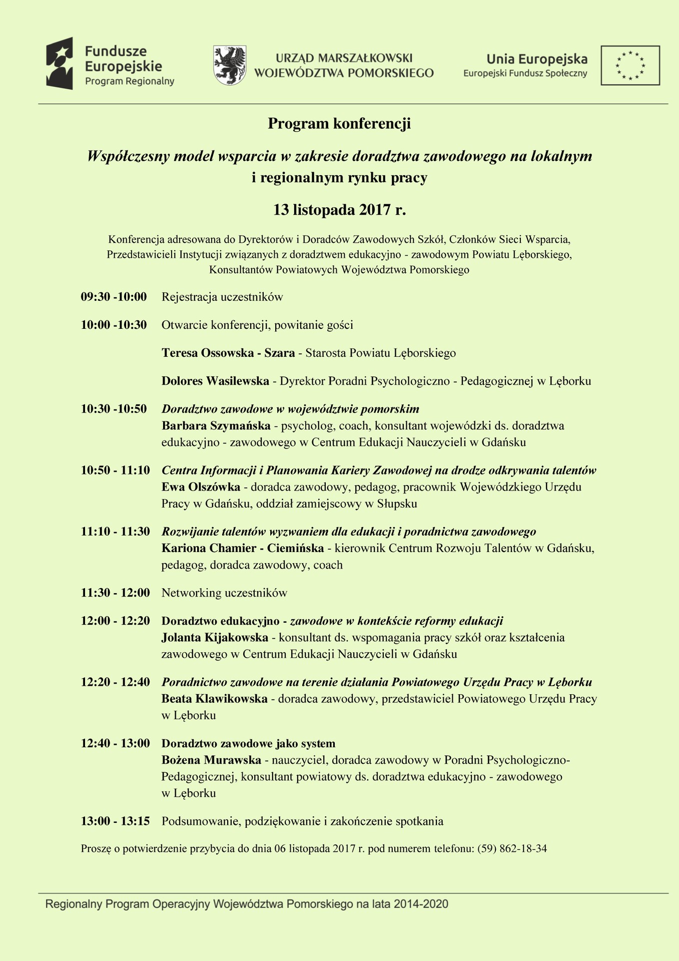 Starosta Lęborski oraz Dyrektor Poradni Psychologiczno-Pedagogicznej w Lęborku organizują konferencję pn. Współczesny model wsparcia w zakresie doradztwa zawodowego na lokalnym i regionalnym rynku pracy". Odbędzie się ona 13 listopada 2017 r. o godz. 10:00 w sali audiowizualnej Zespołu Szkół Mechaniczno-Informatycznych w Lęborku. Konferencja adresowana jest do dyrektorów i doradców zawodowych szkół, członków sieci wsparcia, przedstawicieli instytucji związanych z doradztwem edukacyjno-zawodowym Powiatu Lęborskiego, konsultantów powiatowych Wojeówdztwa Pomorskiego.