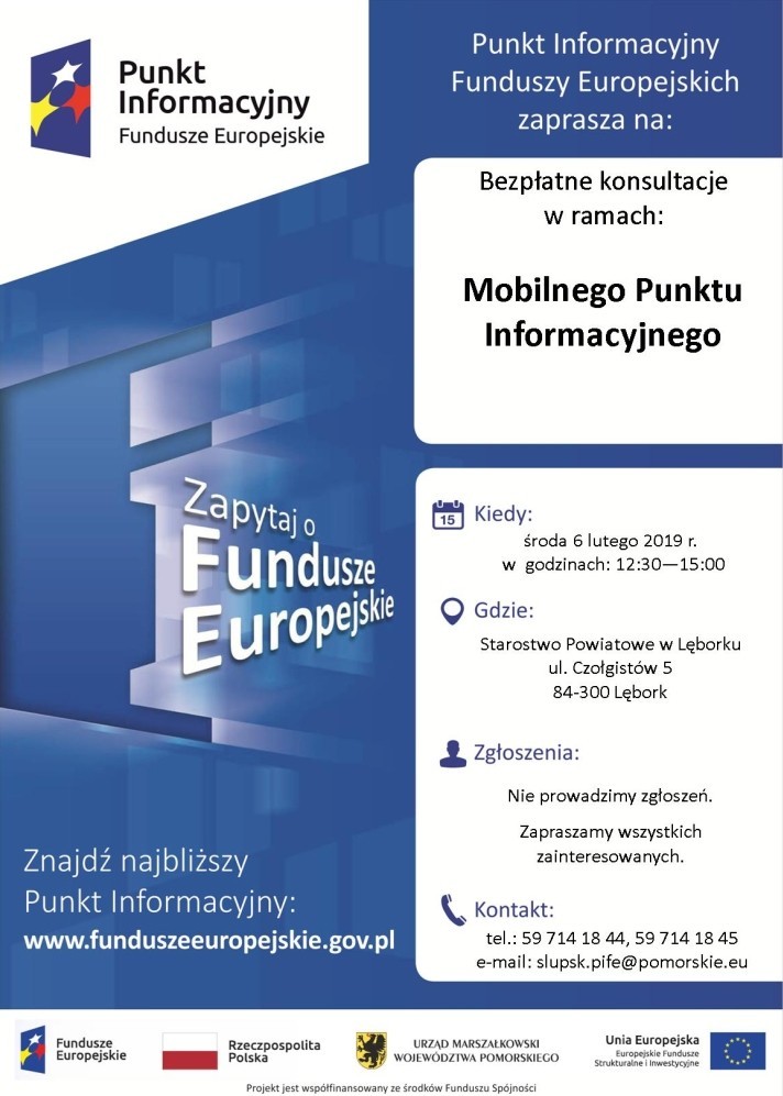 6 lutego br. (w środę) w Starostwie Powiatowym w Lęborku wszyscy zainteresowani uzyskaniem środków finansowych w ramach Unijnych instrumentów wsparcia będą mogli skorzystać z bezpłatnych konsultacji w Mobilnym Punkcie Informacyjnym.