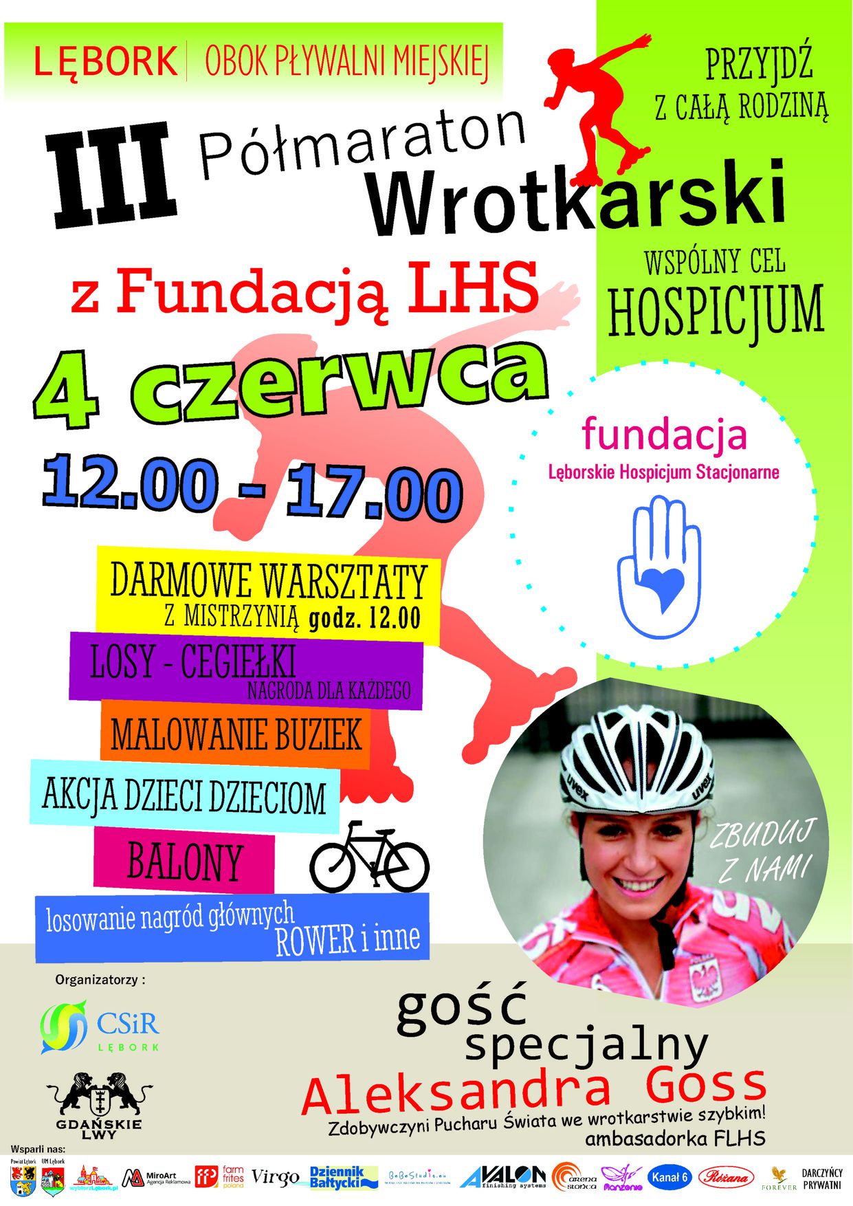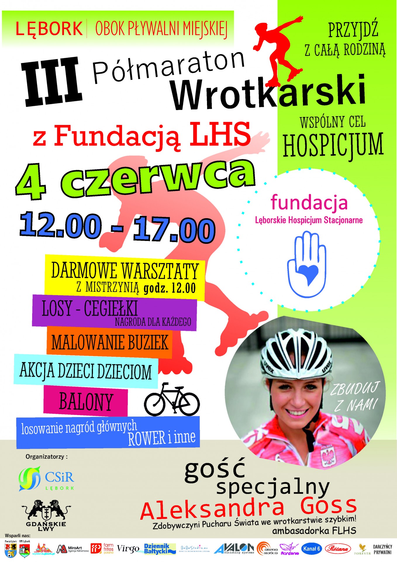 Fundacja Lęborskie Hospicjum Stacjonarne zaprasza na II Półmaraton Wrotkarski, który odbędzie się 4 czerwca br. od godz. 12:00 do 17:00, obok pływalni miejskiej RAFA w Lęborku. Gościem specjalnym półmaratonu będzie Aleksandra Goss, zdobywczyni Pucharu Świata we wrotkarstwie szybkim.