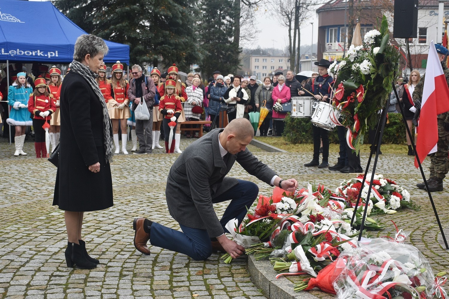 W uroczystym składaniu kwiatów i wieńców uczestniczyli: senator Kazimierz Kleina, posłanka na Sejm RP Henryka Krzywonos-Strycharska, w imieniu posła Piotra Müllera, rzecznika rządu – kierownik Biura Poselskiego w Lęborku Marcin Brodalski, posłankę Barbarę Nowacką reprezentował jej asystent w Lęborku – Jakub Herczyk. Władze Sejmiku Województwa Pomorskiego reprezentowała radna Mirosława Kaczyńska. W imieniu władz Powiatu Lęborskiego, w uroczystościach uczestniczyli: Starosta Lęborski Alicja Zajączkowska, Wicestarosta Lęborski Edmund Głombiewski oraz Danuta Mikołajczyk, Sekretarz Powiatu. Wieniec od mieszkańców Lęborka złożył burmistrz Witold Namyślak. Okolicznościowe wiązanki składali także przedstawiciele radnych powiatowych i miejskich, organizacje społeczne i polityczne, przedsiębiorcy, jednostki oświatowe i urzędy, a także służby mundurowe powiatu lęborskiego i kombatanci.
