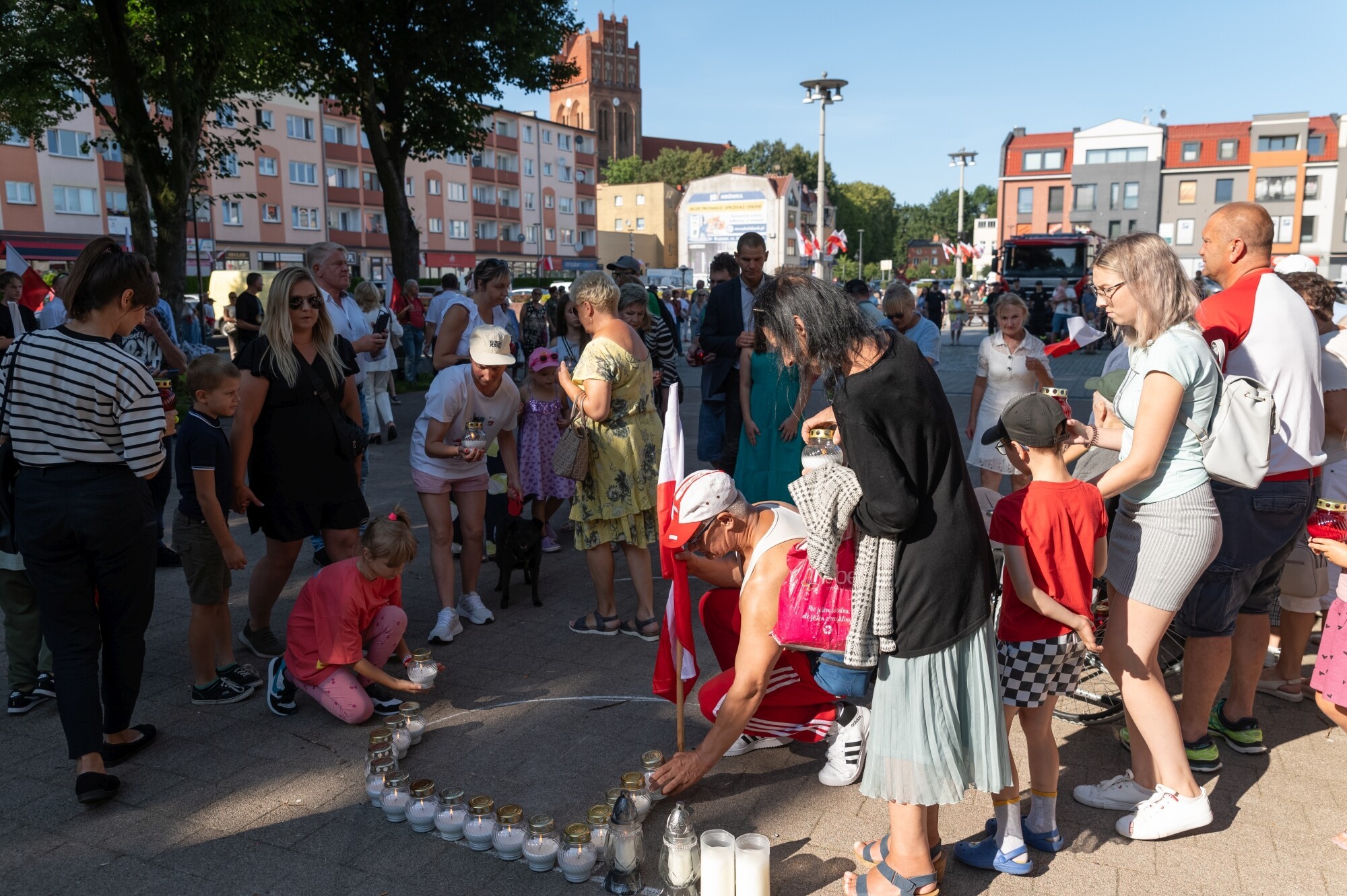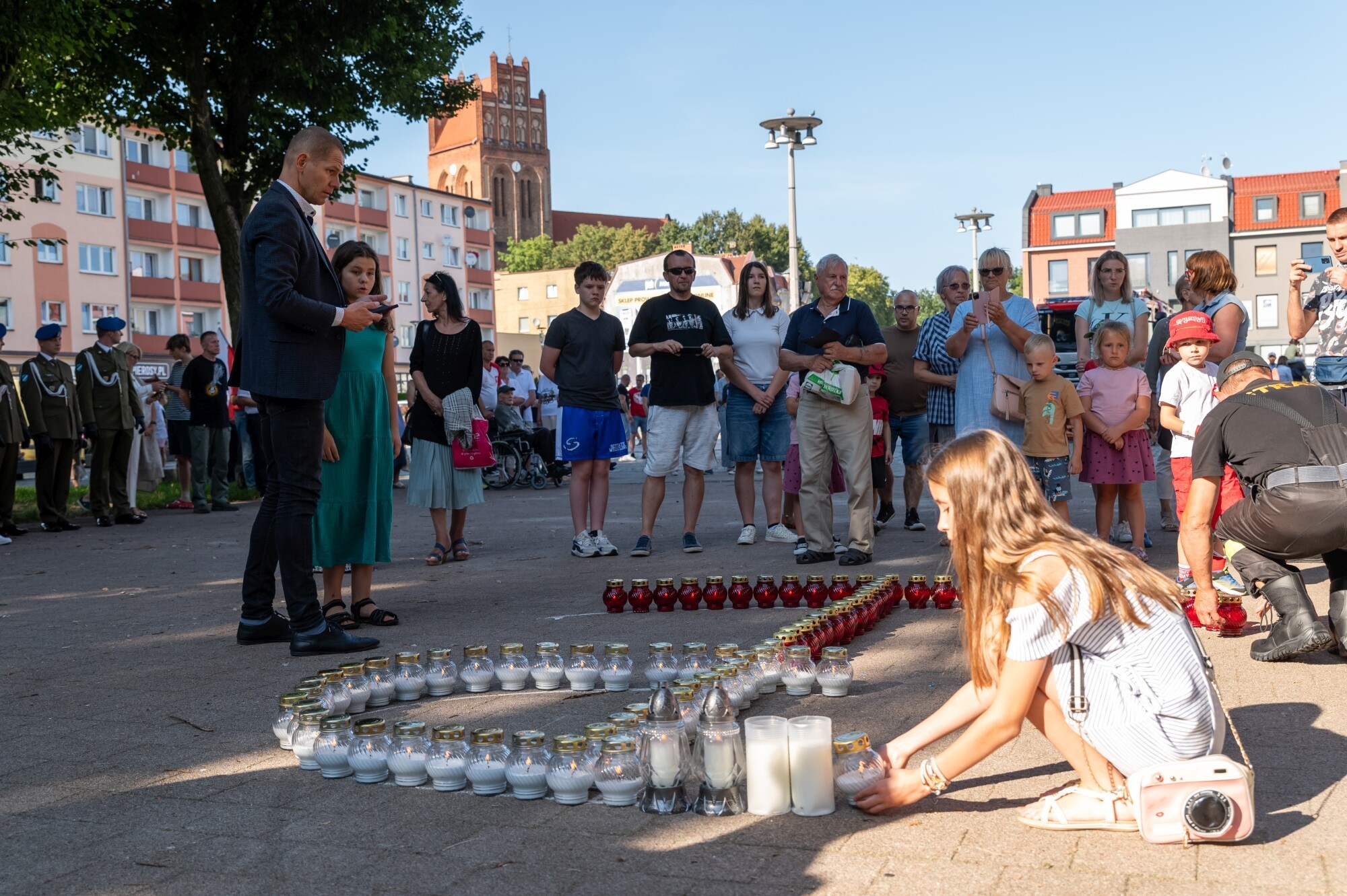 Ciągle żywą historyczną pamięć wydarzeń sprzed 80 lat podkreślił symbol Polski Walczącej z biało–czerwonych zniczy ustawiony wspólnie przez uczestników na Placu Pokoju.