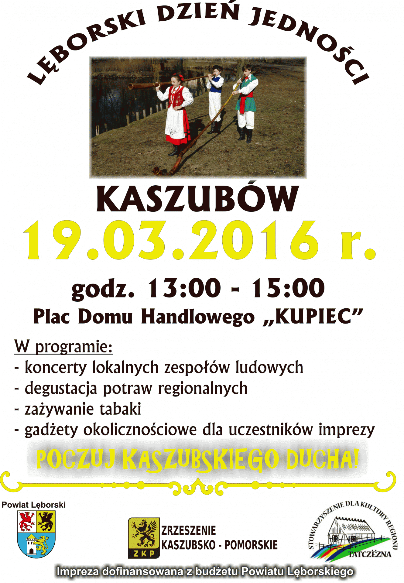 19 marca (sobota) 2016 roku w godz. 13.00 - 15.00 organizatorzy serdecznie zapraszają na Lęborski Dzień Jedności Kaszubów.
