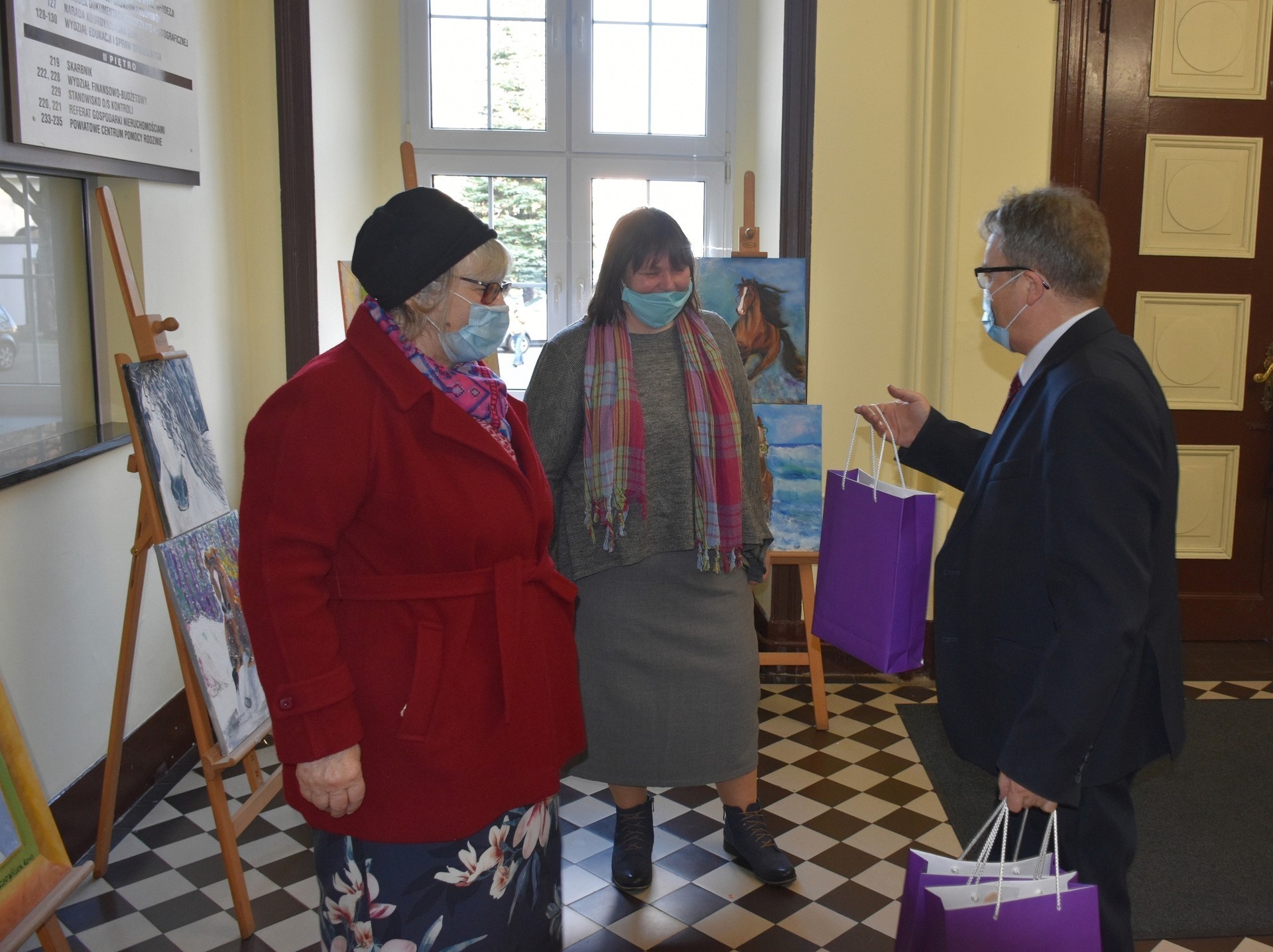 Podczas instalacji wystawy, z artystkami spotkał się Edmund Głombiewski, Wicestarosta Lęborski, który już podczas nowowiejskiego wernisażu był urzeczony twórczością obu pań. Wręczeniu drobnych upominków towarzyszył moment rozmowy o sztuce, tworzeniu, o pasjach.