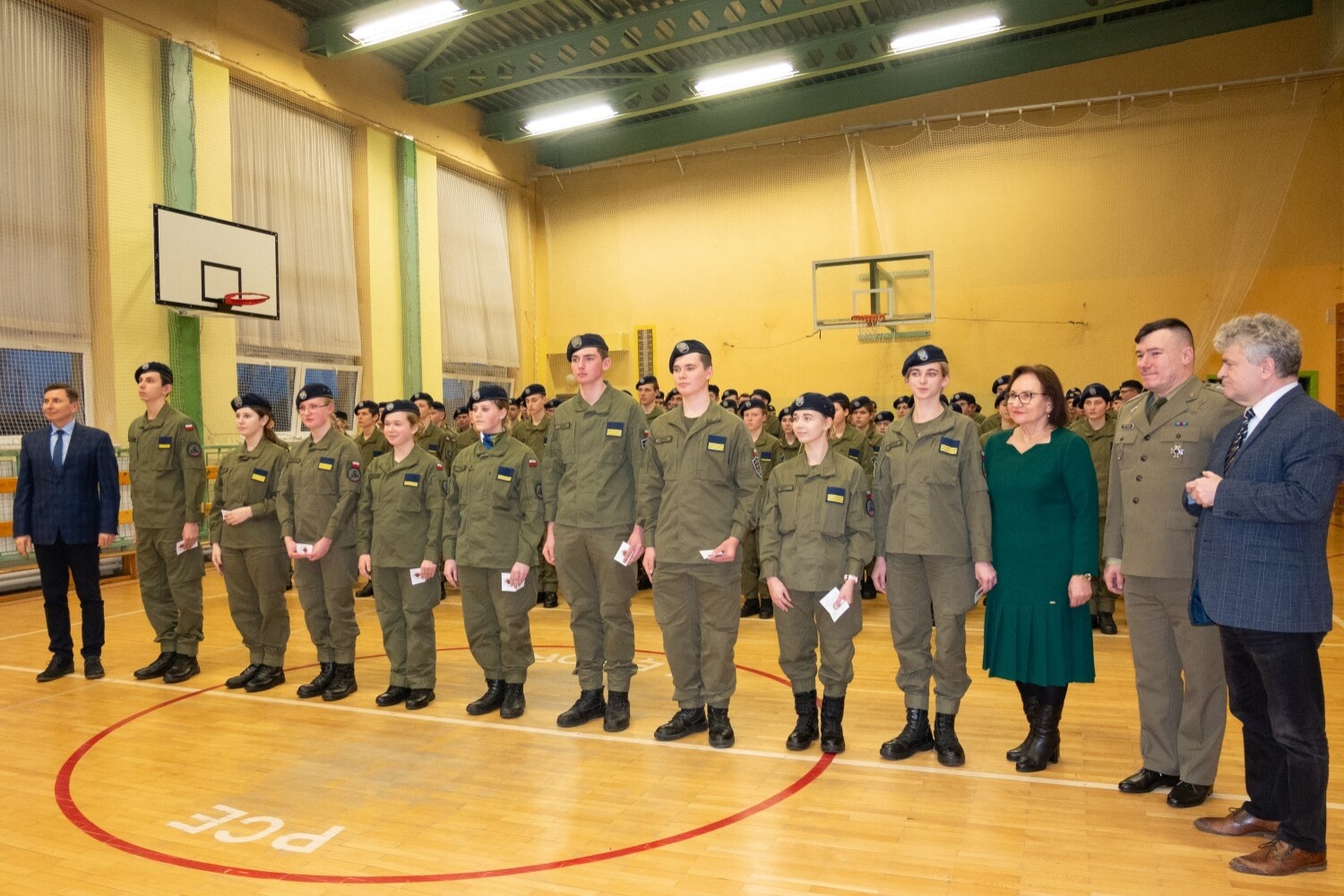 26 uczniów klas mundurowych Powiatowego Centrum Edukacyjnego otrzymało odznaki „Wzorowy kadet” – złote, srebrne i brązowe. Uroczysty apel klas mundurowych stał się również okazją do mianowania kadetów klas pierwszych. Nominacje i wyróżnienia wręczali płk Michał Pietrzak, dowódca 1. Lęborskiego Batalionu Zmechanizowanego im. gen. Jerzego Jastrzębskiego w towarzystwie koordynatora współpracy batalionu ze szkołą st. chor. sztab. Edwarda Tydy oraz samorządowcy: Alicja Zajączkowska – Starosta Lęborski i burmistrz Lęborka Witold Namyślak.