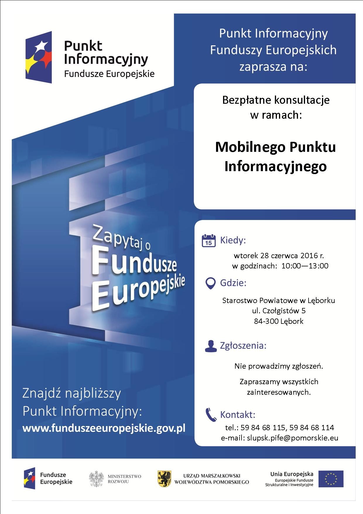 Lokalny Punkt Informacyjny Funduszy Europejskich w Słupsku zaprasza wszystkie osoby zainteresowane pozyskaniem Funduszy Europejskich do Mobilnego Punktu Informacyjnego (MPI). Bezpłatne konsultacje odbędą się 28 czerwca 2016 roku (wtorek), w godzinach 10:00 – 13:00 w Starostwie Powiatowym w Lęborku, ul. Czołgistów 5.