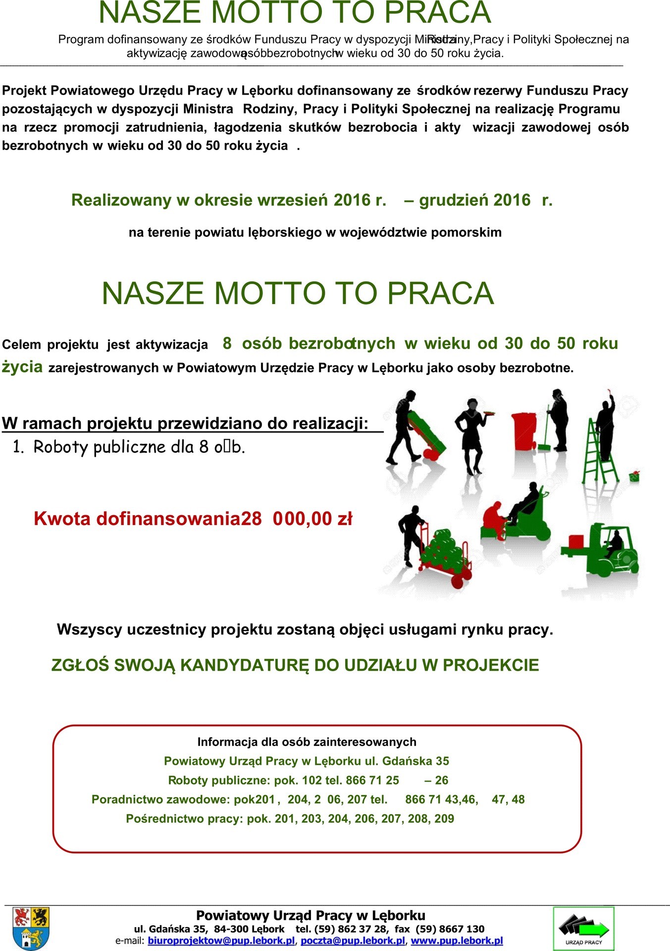 Powiatowy Urząd Pracy w Lęborku informuje, iż pozyskał dodatkowe środki Funduszu Pracy pozostające w dyspozycji Ministra Rodziny, Pracy i Polityki Społecznej na realizację programu na rzecz promocji zatrudnienia, łagodzenia skutków bezrobocia i aktywizacji zawodowej dla osób bezrobotnych w wieku od 30 do 50 roku życia, projekt pn. „Nasze motto to praca”.
